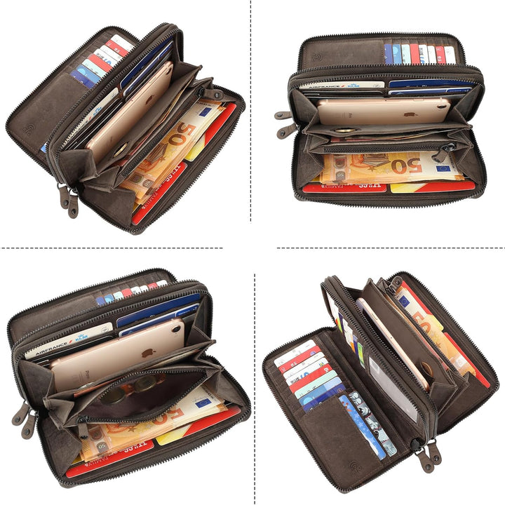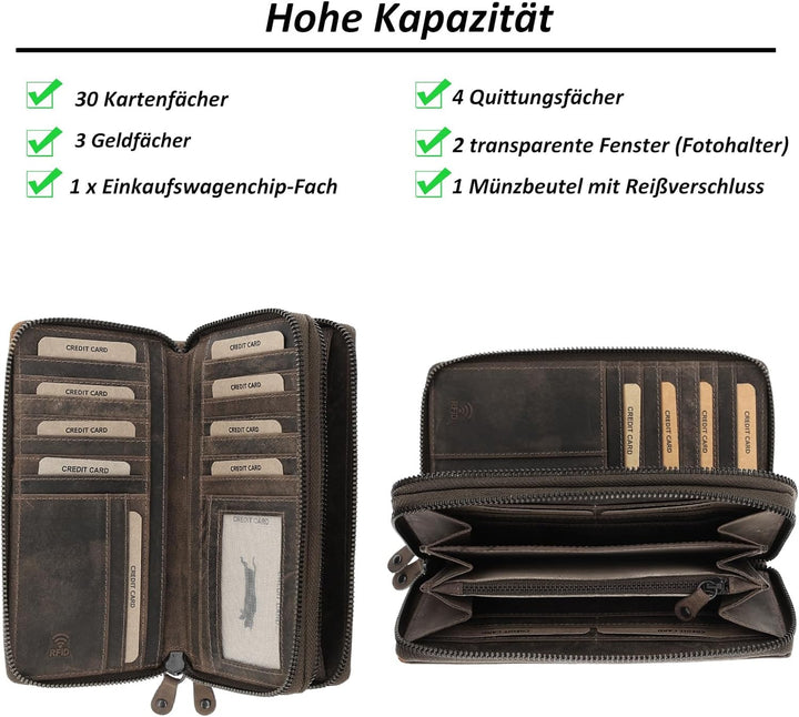 - 【Praktische Kapazität】:Geldbeutel damen mit insgesamt 29 Card Slots,4 Receipt Slots,3 Cash Compartments,1 Clear Windows(Photo Holders),1 x fach fuir einkaufswagenchip,1 Zipped Coin Pocket.Portmonee herren genügend Platz für all Ihre Karten,