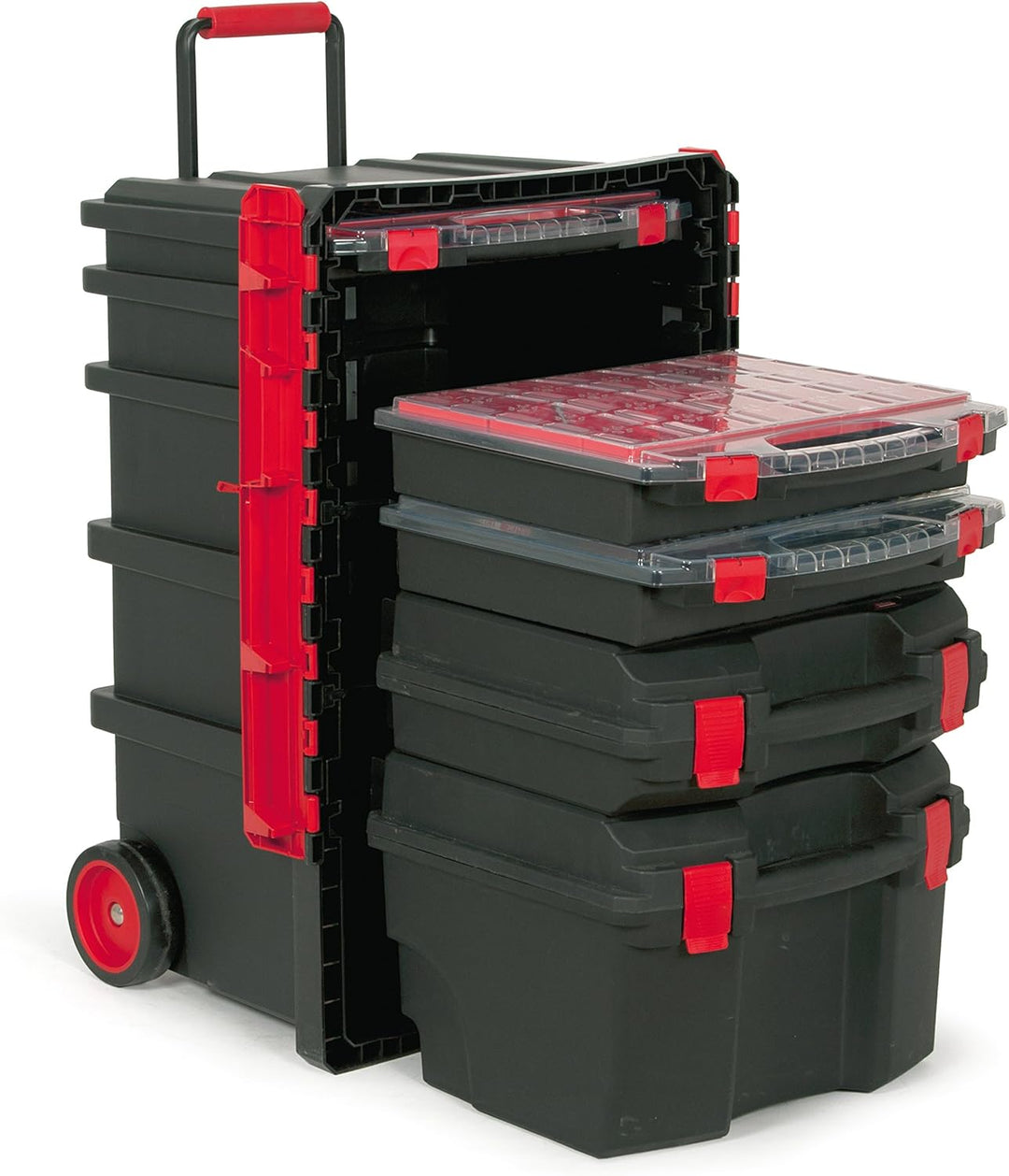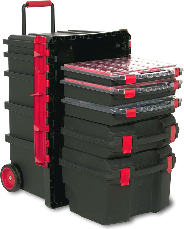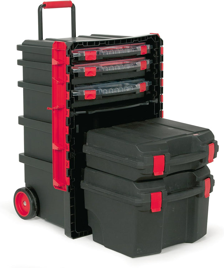 - Kunststoffkoffer mit Aufnahmen für Kleinteileboxen, gummierte Laufrollen und Teleskopgriff