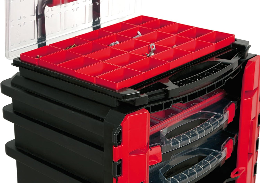 - Die Trail Box Pro bietet Platz für 1 Kleinteilebox 430-50-25, 1 Kleinteilebox 430-80-13, 1 Kleinteilebox 430-80-0, 1, Kunststoffkoffer N° 44B und einen Unterschubkasten 290x430x370 mm
