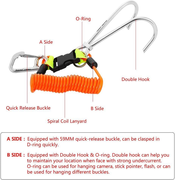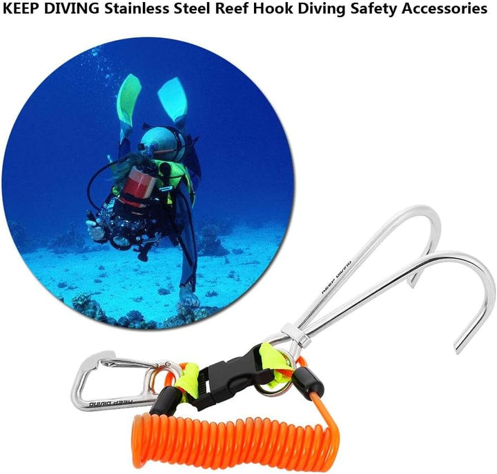 • 【Funktion】 - Reef Hook Edelstahl Doppelhaken mit Spirale Spule Lanyard kann Ihnen helfen, Ihren Standort bei starker Unterströmung zu halten, oder kann zum Aufhängen verschiedener Schnallen verwendet werden.