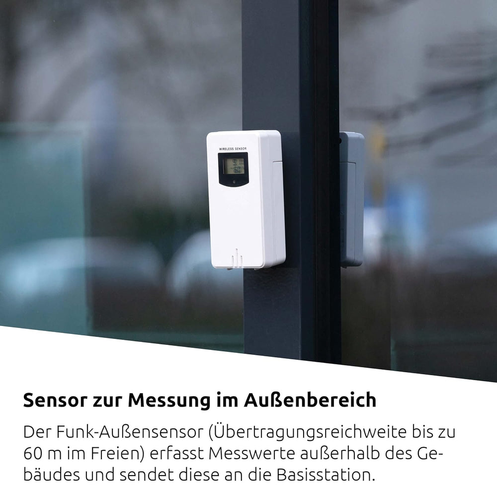 • Küche, Wohnzimmer oder Hobbyraum, der Innensensor liefert Messdaten innerhalb von Gebäuden. Der Funk-Aussensensor erfasst und sendet Wetterdaten bis zu einer Reichweite von 60m schnell und einfach an die Basisstation