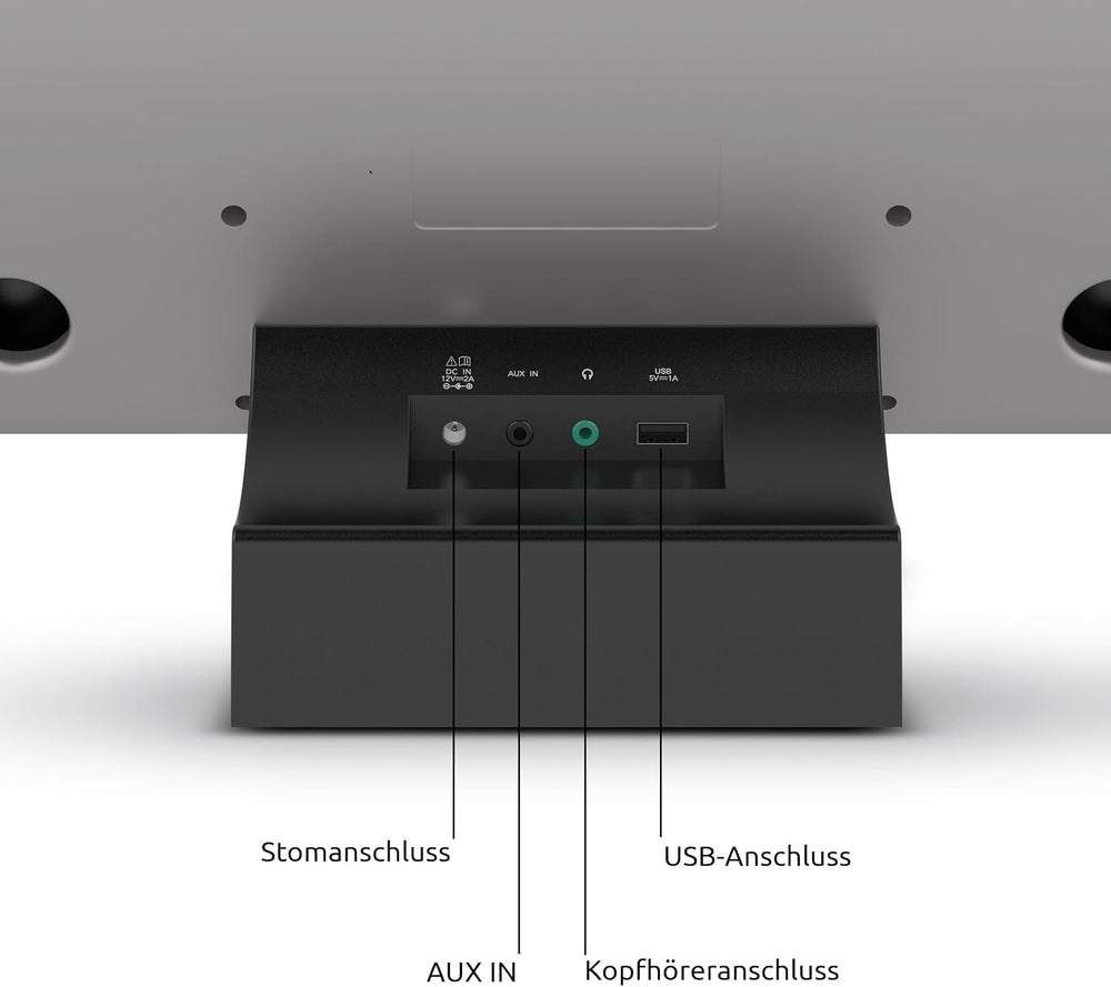 • Anschlüsse: integriertes WLAN, 1 x USB auf der Rückseite mit Wiedergabe und Ladefunktion, AUX in, Kopfhöreranschluss (3,5mm Klinke), F-Buchse für externe Antenne, WiFi inkl. UPnP Audiostreaming