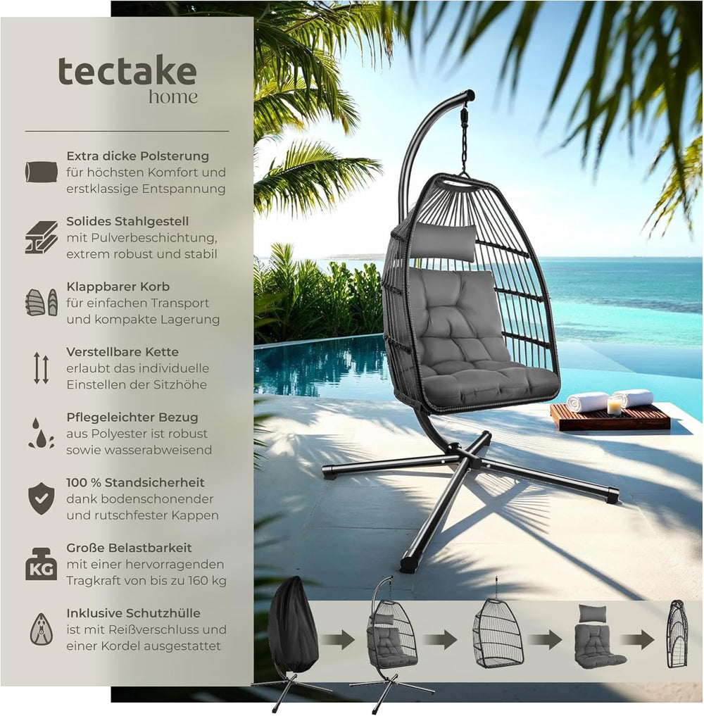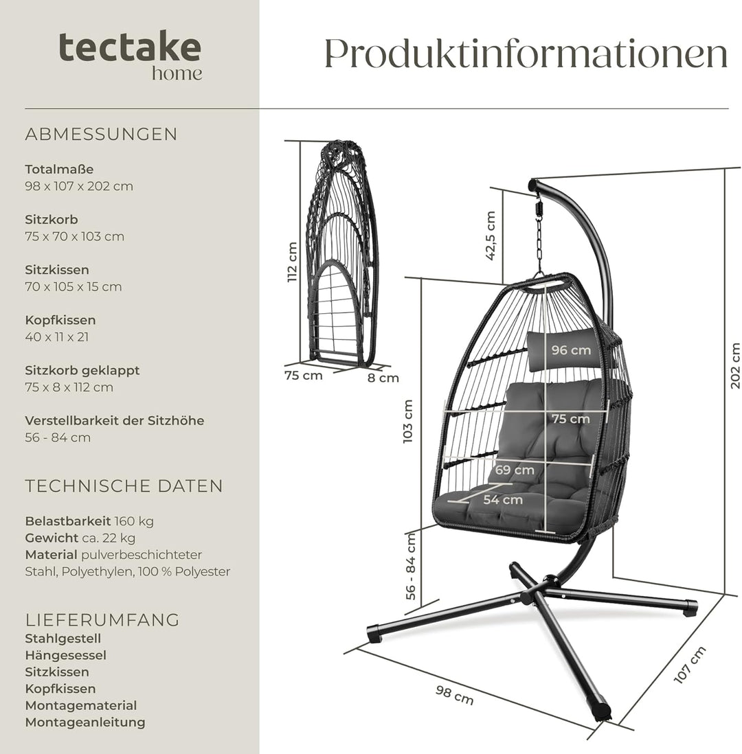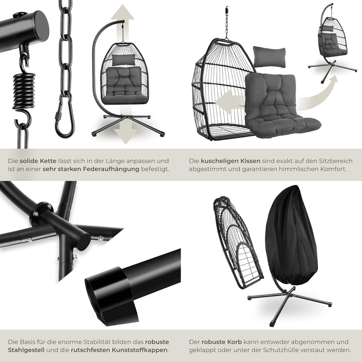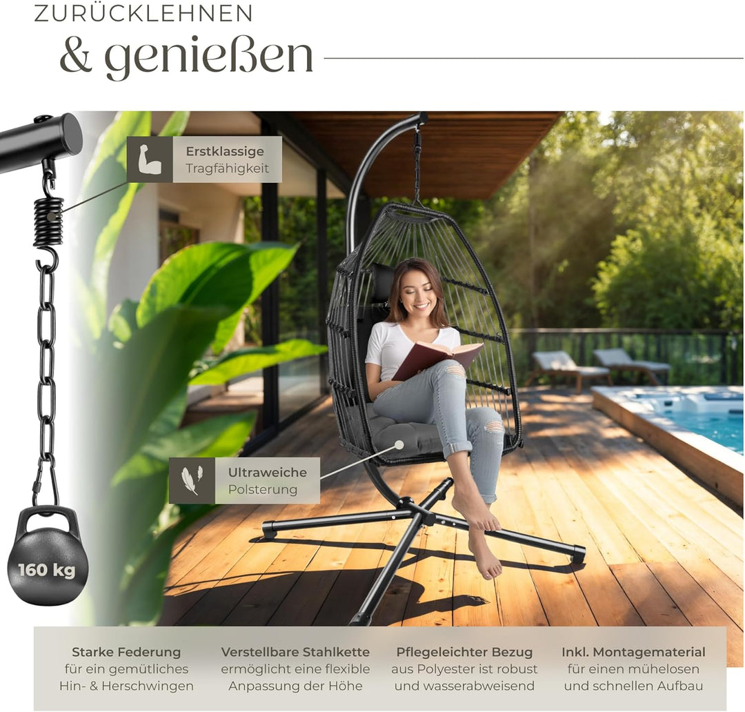 - MAXIMALER KOMFORT UND SICHERER STAND: Ein extra dickes und ergonomisches Kissen passt sich perfekt Deiner Körperform an, wodurch die Hängeschaukel auch nach Stunden extrem bequem bleibt. Dabei steht das Hängesessel Gestell sicher auf 4 Beinen, was