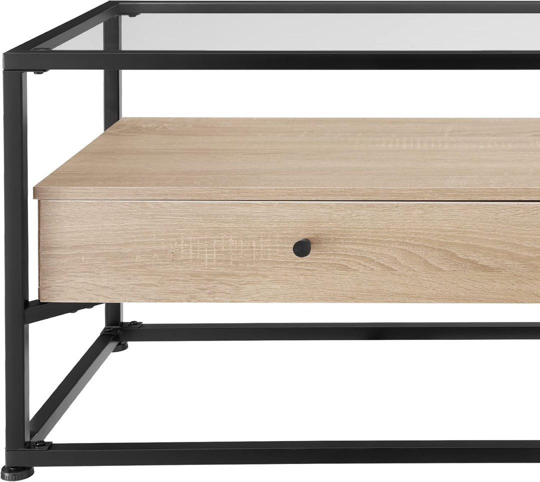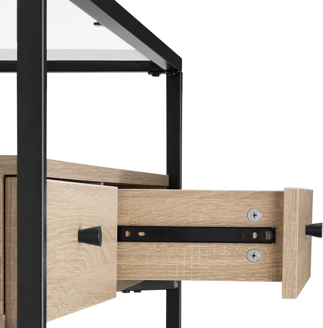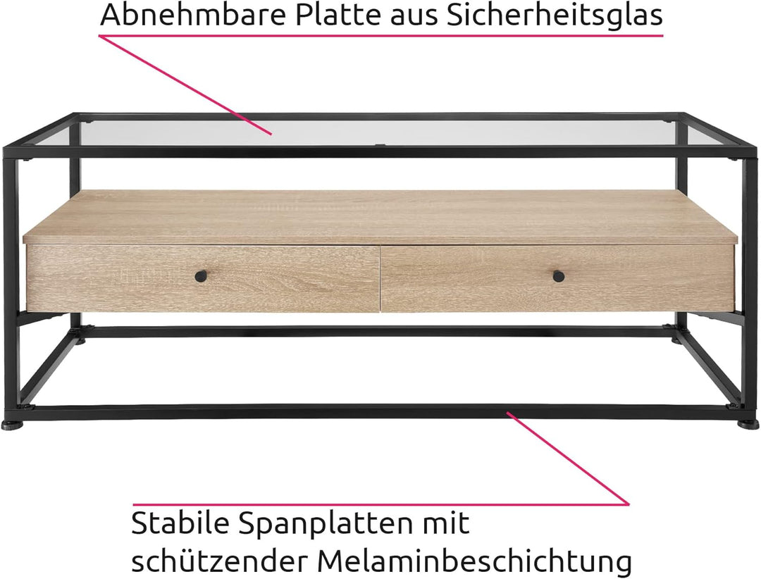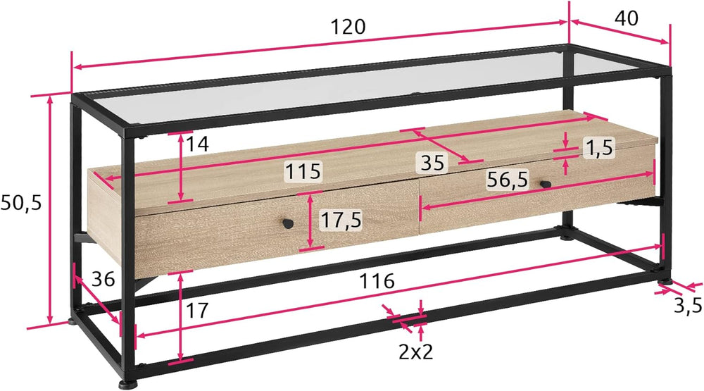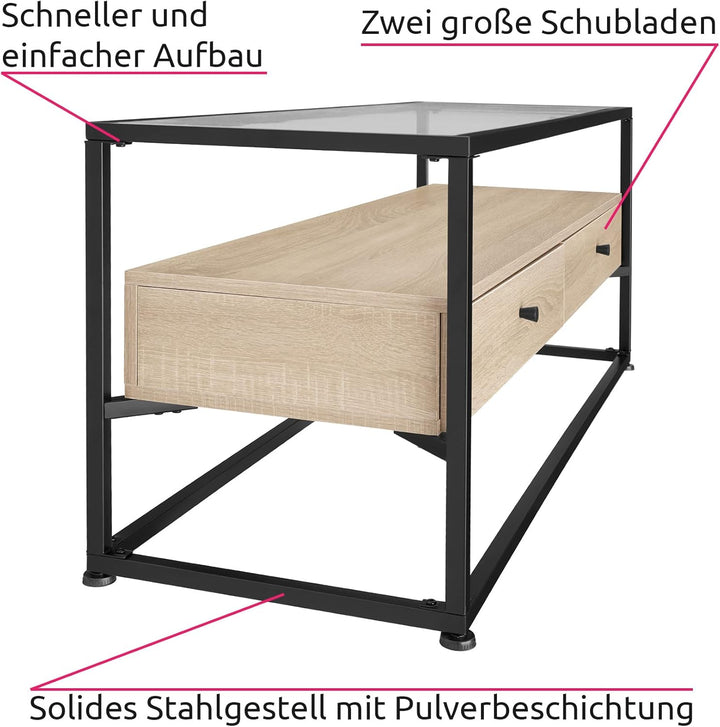 - PRODUKT-DETAILS: Totalmasse (BxTxH): ca. 121,5 x 41,5 x 50,5 cm // Glasplatte (BxTxH): 1158 x 358 x 5 mm // Oberseite Mittelteil (BxT): ca. 115 x 35 cm // Innenmasse je Schublade (BxTxH): ca. 50 x 31 x 9 cm // Dicke der Spanplatten: ca. 1,5 cm //