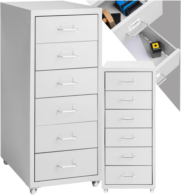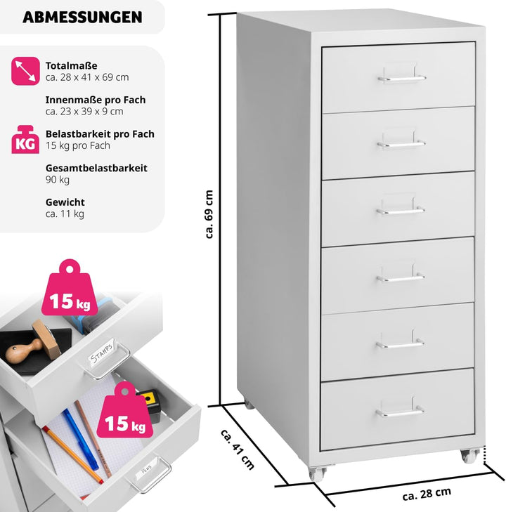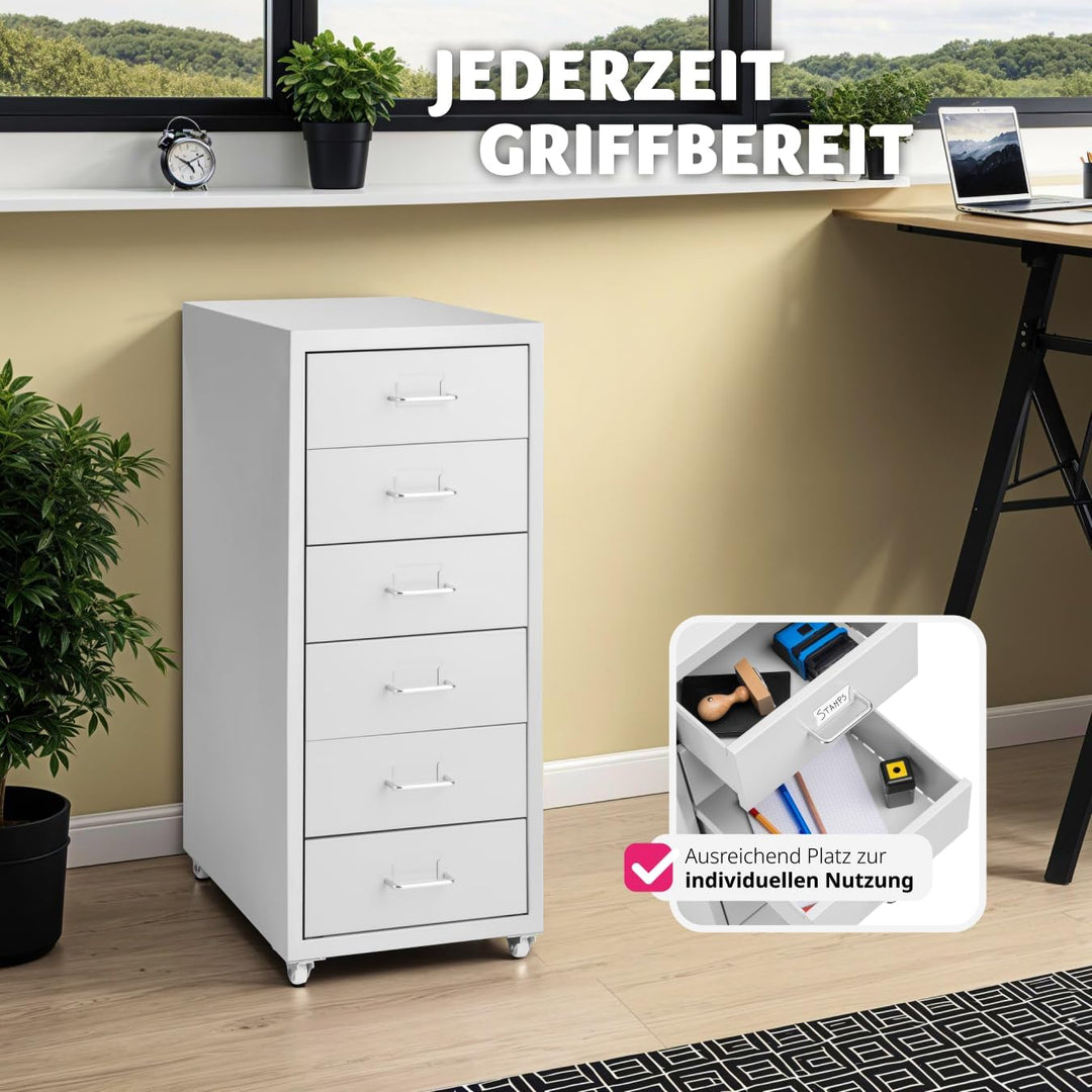 - SCHUBLADENBOXEN FÜR STAURAUM: Unser Rollcontainer bietet Dir grosszügigen Stauraum dank geräumiger Schubladen. Der pulverbeschichtete Stahl sorgt für eine robuste und langlebige Konstruktion. Perfekt für die Aufbewahrung von Dokumenten,