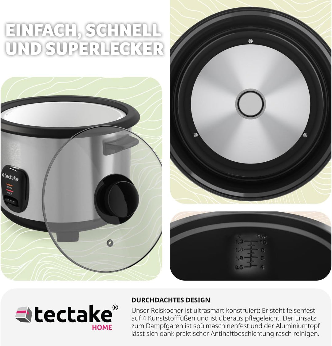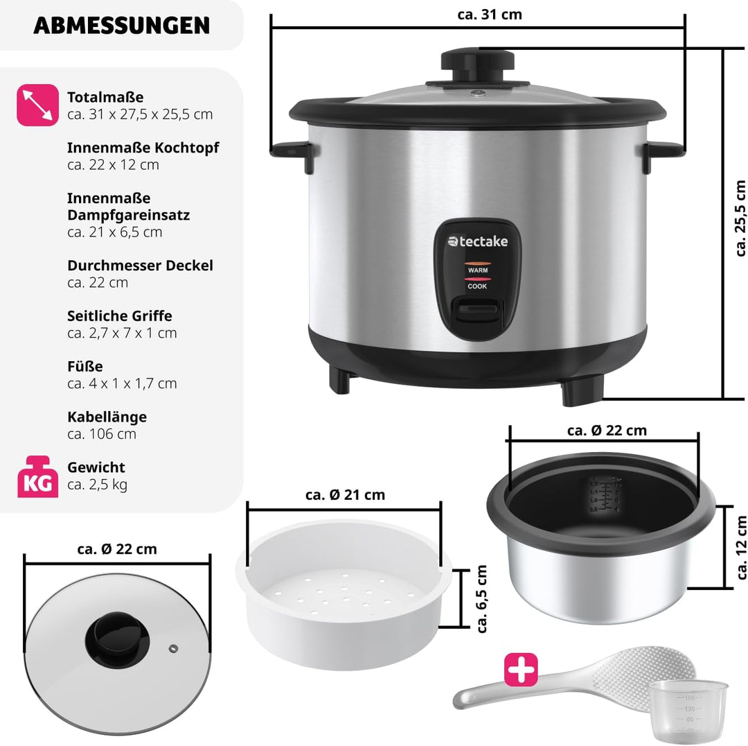 - DAMPFGARER TOPF MIT SOLIDEM STAHLGEHÄUSE: Der Reiskocher gross besticht durch sein robustes Stahlgehäuse und den entnehmbaren Aluminiumtopf mit Antihaftbeschichtung. Diese Kombination gewährleistet eine einfache Reinigung und langlebige Nutzung.