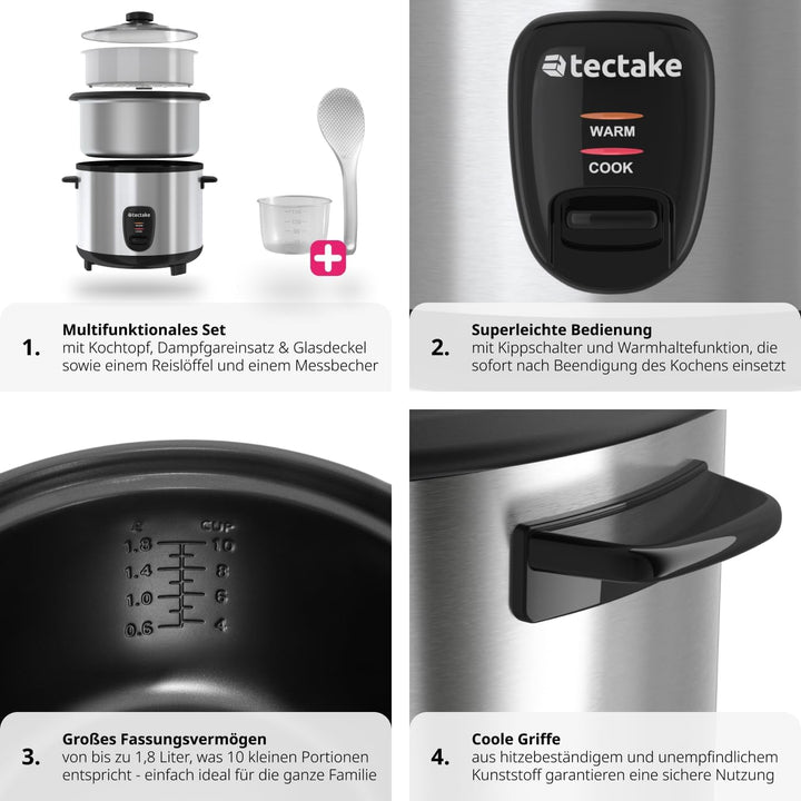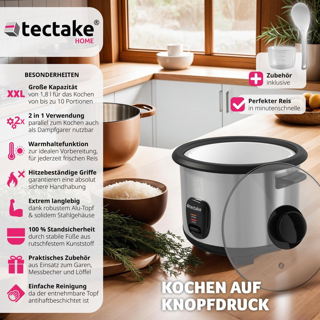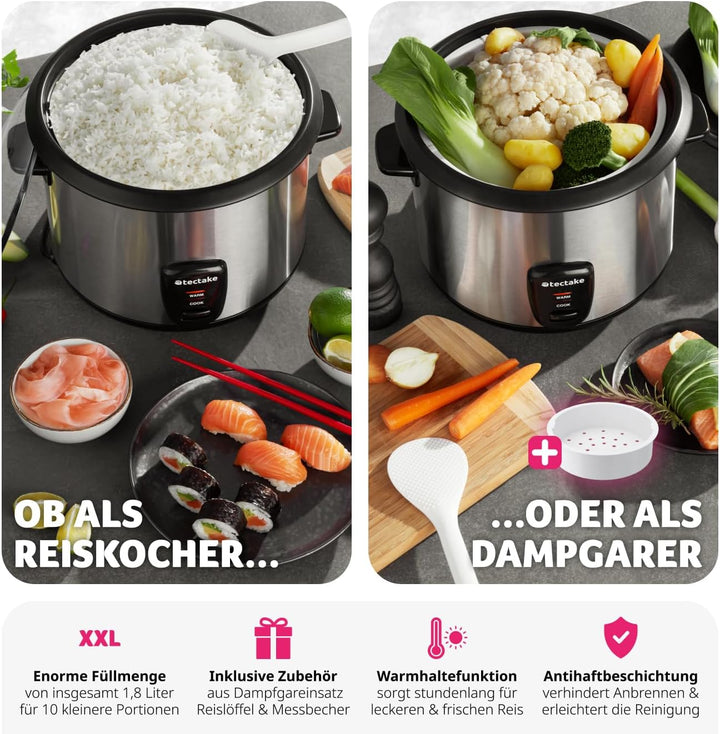 - MULTICOOKER MIT GROssER KAPAZITÄT: Mit einer beeindruckenden Kapazität von 1,8 Litern ist dieser Reis Dampfer ideal für grosse Familien oder Dinnerpartys. Er bietet genug Platz für bis zu zehn Portionen Reis, was ihn zu dem Highlight der