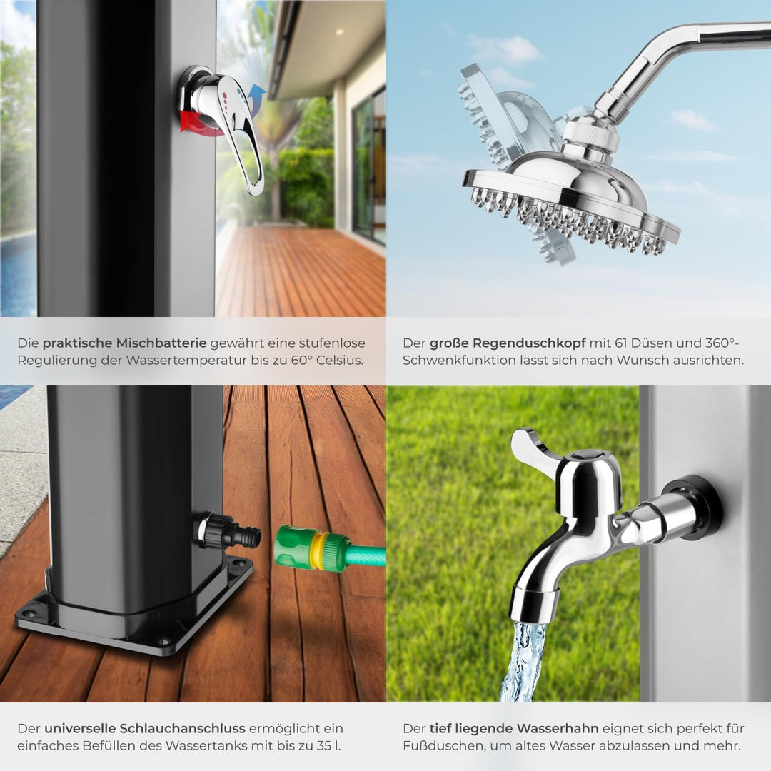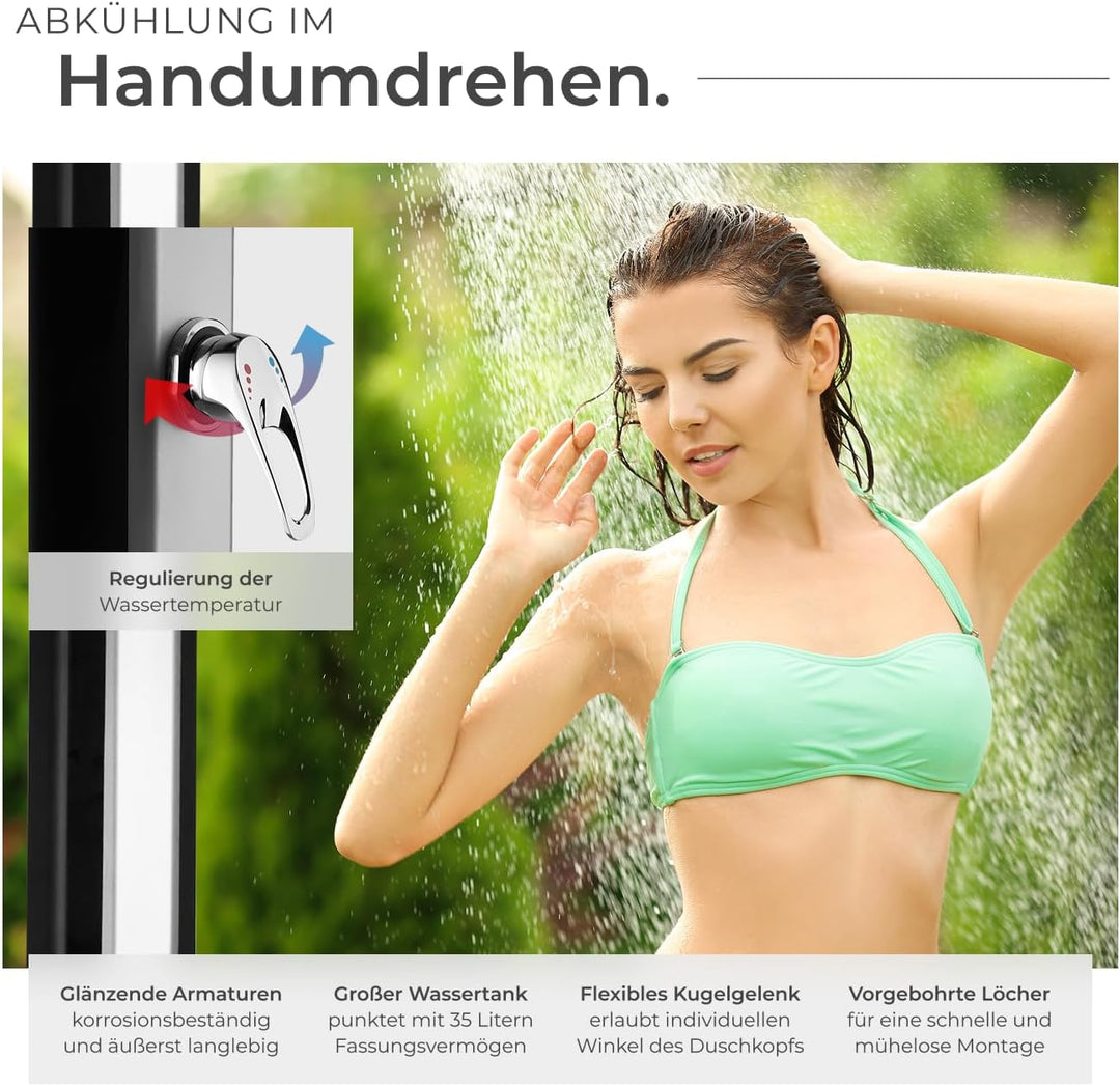 - KORROSIONS-, TEMPERATUR-, UND UV-BESTÄNDIGE AUssENDUSCHE GARTEN : Diese Solar Dusche besticht durch ihre hochwertige Konstruktion, die korrosionsbeständig, temperaturbeständig und UV-beständig ist. Diese Eigenschaften sorgen dafür, dass die outdoor