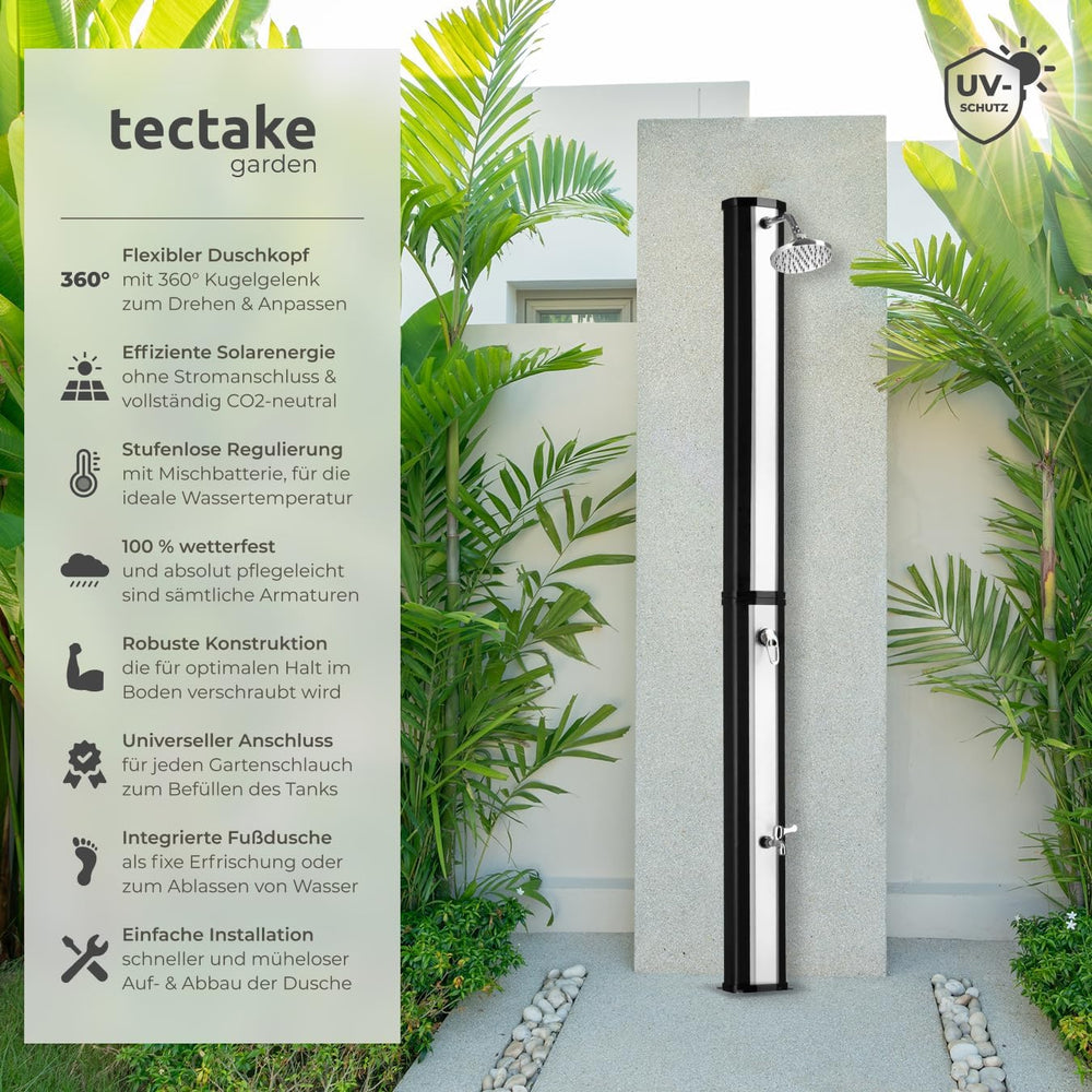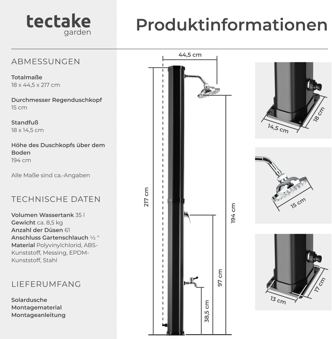 - GARTENBRAUSE MIT EINFACHER MONTAGE: Die Solar Gartendusche ist kinderleicht zu montieren und zu demontieren, was sie zur perfekten Lösung für temporäre Lösungen z.B. als Camping Dusche macht. Im Lieferumfang ist das Montagematerial für die