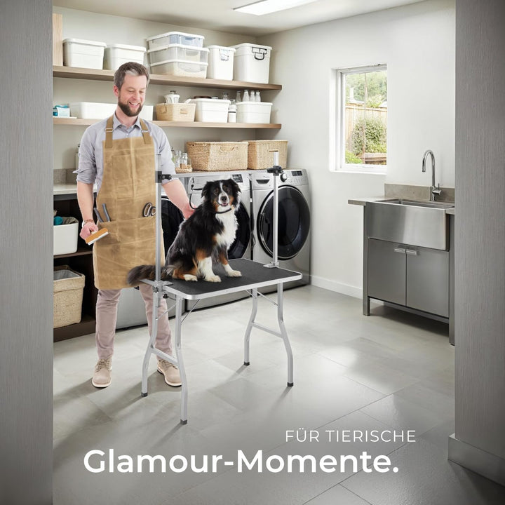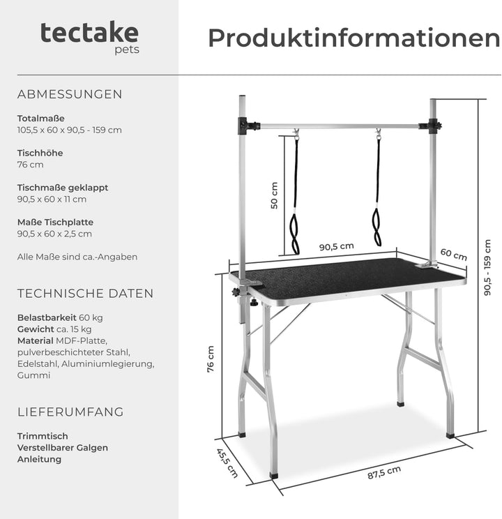 - Mache die Fellpflege für Dich und Deinen Vierbeiner zu einem angenehmen Erlebnis mit dem Trimmtisch von TecTake // Totalmasse (BxTxH): ca. 105,5 x 60 x 90,5 – 159 cm.