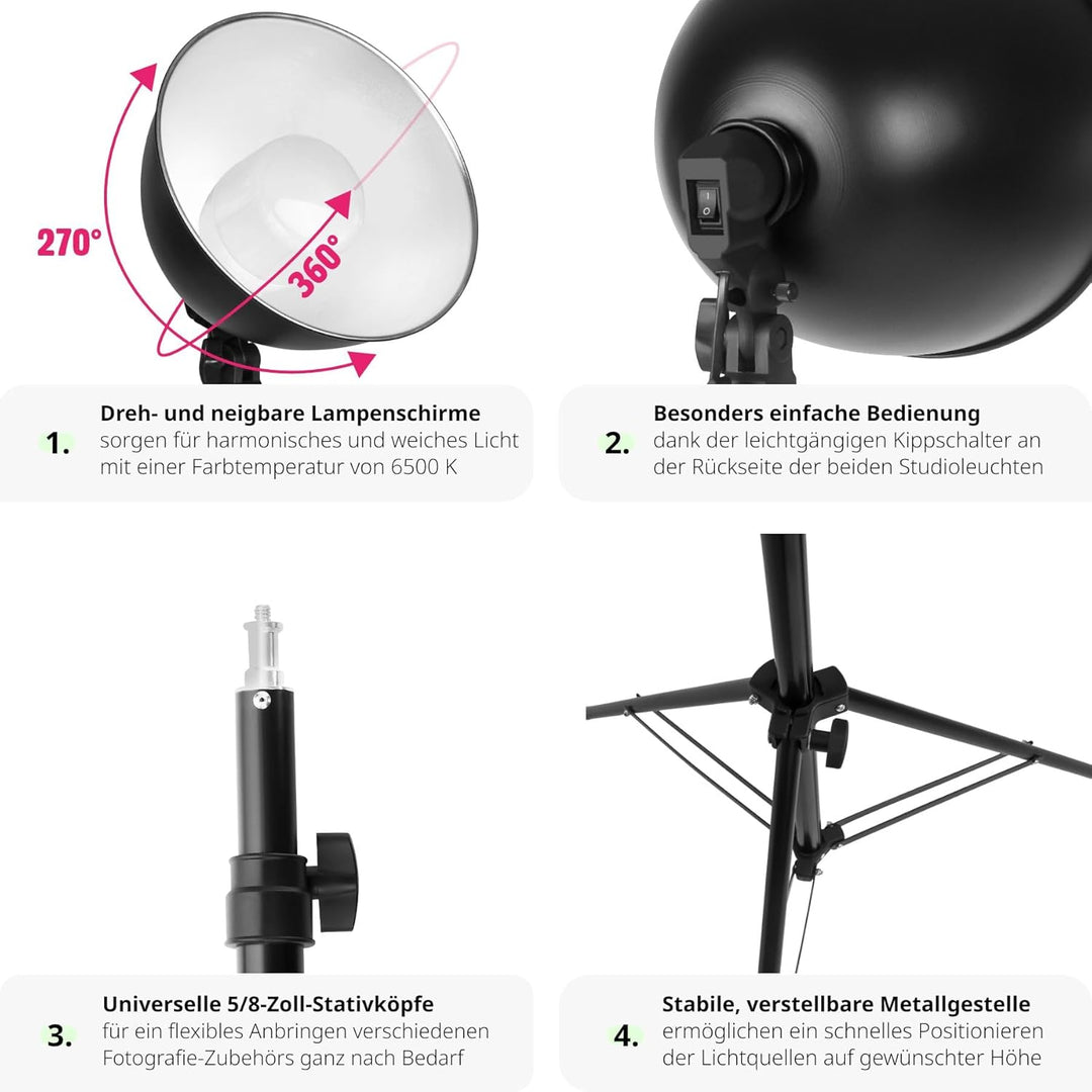 - Mit dem stabilen Stativ lässt sich die Lichtquelle schnell auf die gewünschte Höhe einstellen