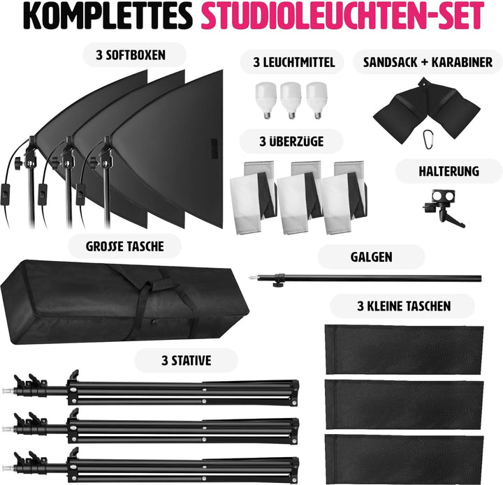 - Komplettes Studioleuchten Set: 3x Stativ + 1x Galgen + 3x Leuchtmittel + 3x Softbox + Tasche