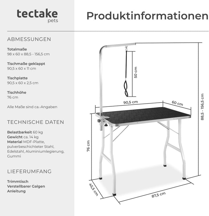 - Stressfreie Schur auf angenehmer Arbeitshöhe: Das bietet der multifunktionale Trimmtisch von TecTake // Totalmasse (BxTxH): ca. 98 x 60 x 88,5 – 156,5 cm // Tischhöhe: ca. 76 cm.