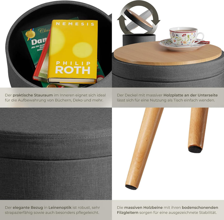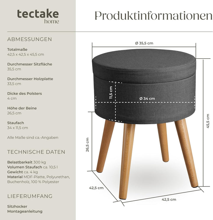 - PRODUKT-DETAILS: Totalmasse (ØxH): ca. 35,5 x 45,5 cm // Dicke des Polsters: ca. 4 cm // Masse Staufach (ØxH): ca. 34 x 11,5 cm // Höhe der Beine: ca. 26,5 cm // Belastbarkeit: 300 kg // Gewicht: ca. 3,8 kg.