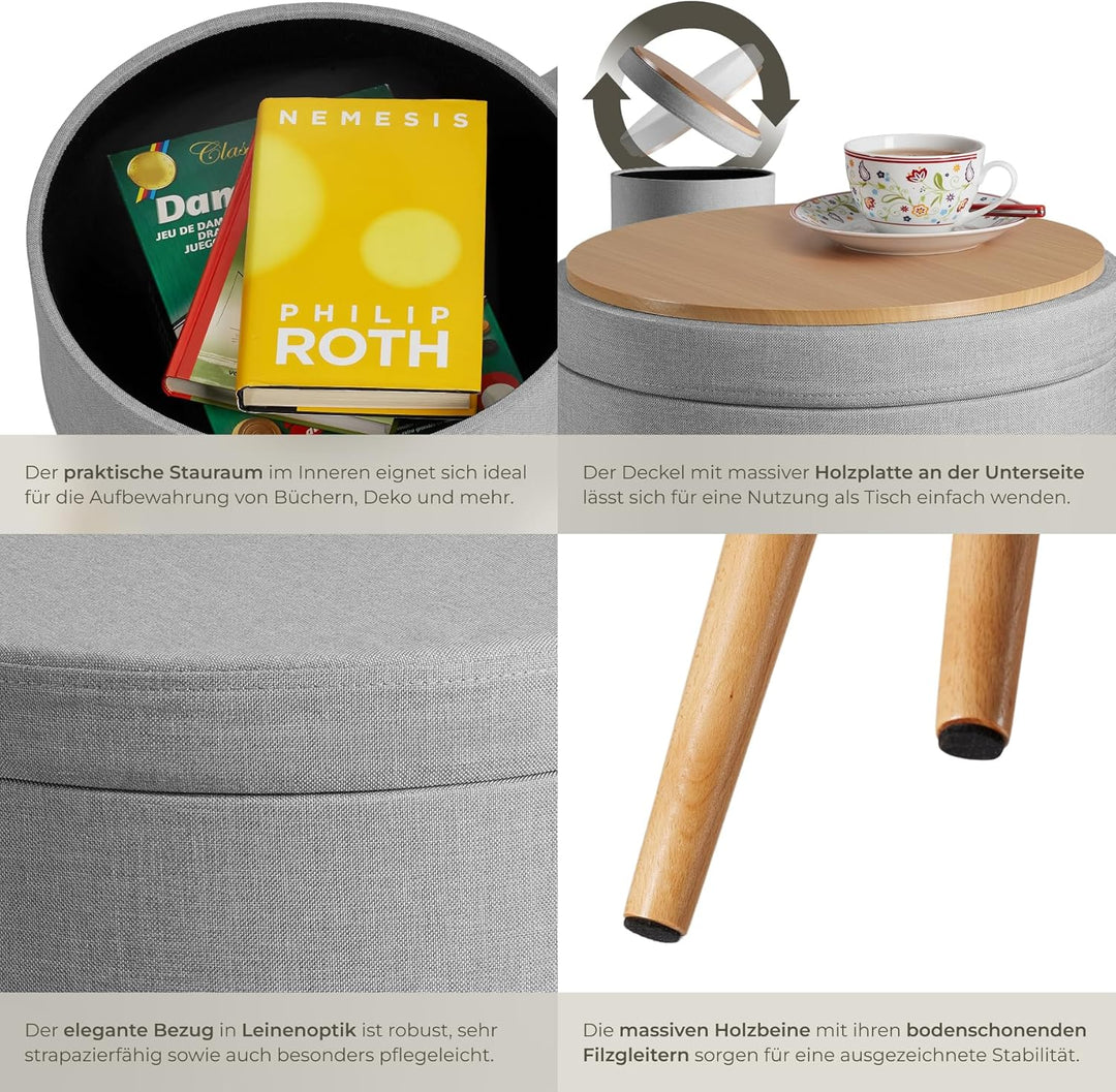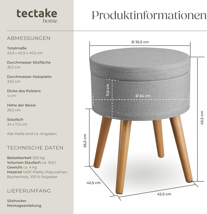 - PRODUKT-DETAILS: Totalmasse (ØxH): ca. 35,5 x 45,5 cm // Dicke des Polsters: ca. 4 cm // Masse Staufach (ØxH): ca. 34 x 11,5 cm // Höhe der Beine: ca. 26,5 cm // Belastbarkeit: 300 kg // Gewicht: ca. 3,8 kg.