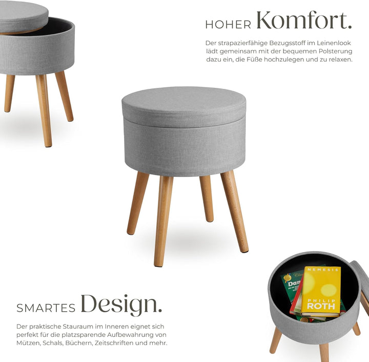 - DURCHDACHTES DESIGN: Dass der handliche Hocker viel mehr ist, als ein gut aussehendes Deko-Element, beweist die hohe Belastbarkeit, das praktische Staufach und die angenehme Polsterung.