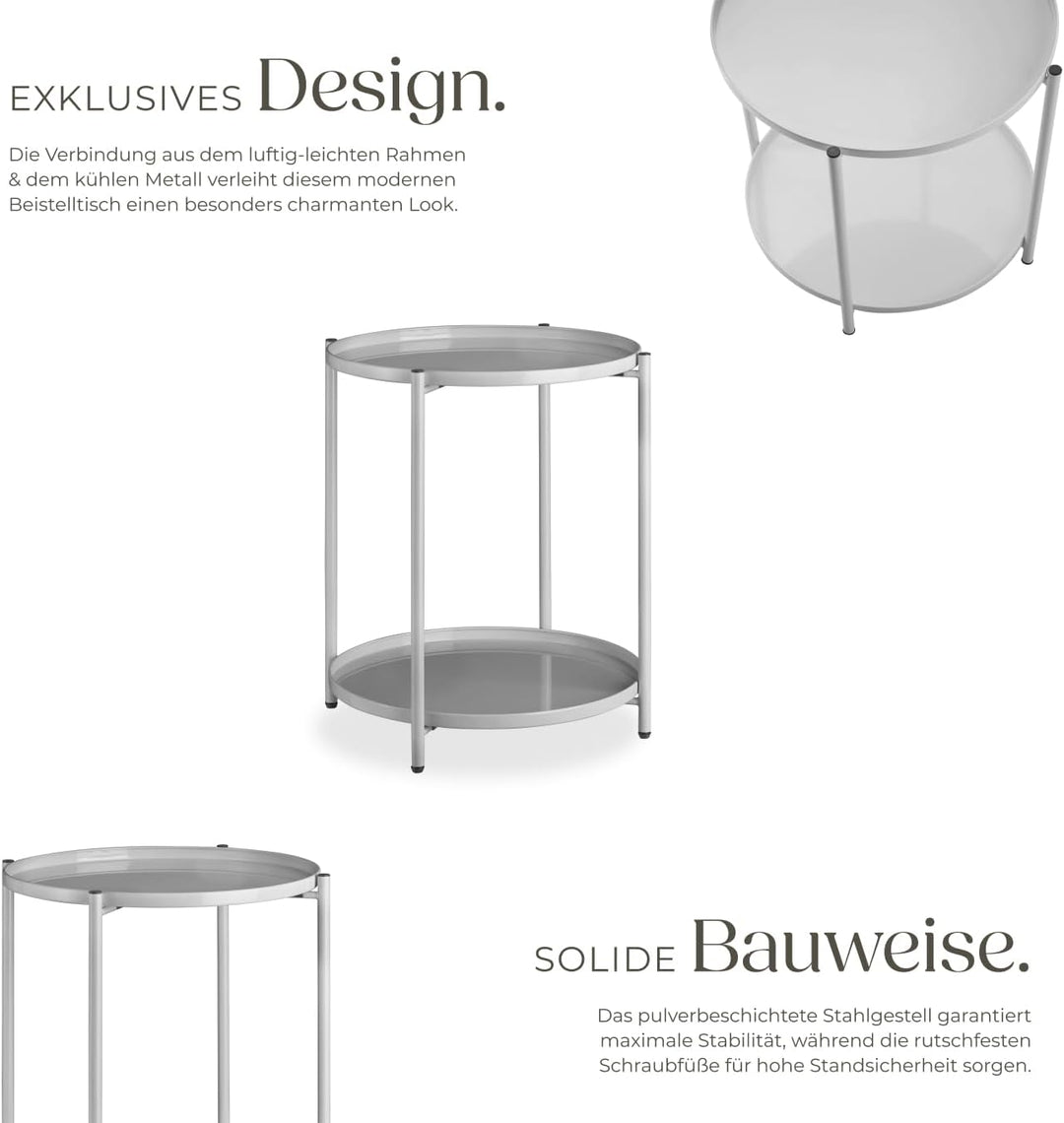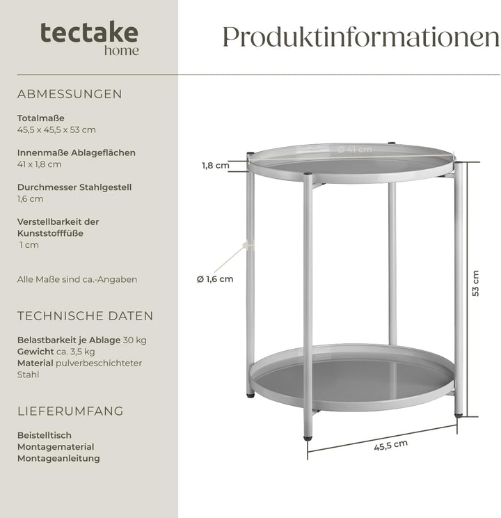- PRODUKT-DETAILS: Totalmasse (LxBxH): ca. 45,5 x 45,5 x 53 cm // In-nenmasse Ablageflächen (ØxH): ca. 41 x 1,8 cm // Durchmesser Stahlge-stell: ca. 1,6 cm // Verstellbarkeit der Kunststofffüsse: ca. 1 cm // Belast-barkeit pro Ablagefläche: 30 kg //