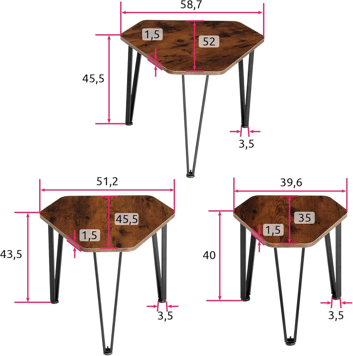 - PRODUKT-DETAILS: Grosser Beistelltisch (LxBxH): ca. 58,7 x 52 x 45,5 cm // Mittlerer Beistelltisch (LxBxH): ca. 51 x 45,5 x 43,5 cm // Kleiner Beistelltisch (LxBxH): ca. 39,5 x 35 x 40 cm // Dicke der Spanplatten: ca. 1,5 cm // Stahlgestelle (BxT): ca. 2