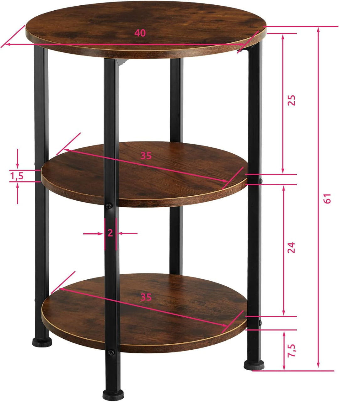 - PRODUKT-DETAILS: Totalmasse (ØxH): ca. 40 x 61 cm // Durchmesser obere Ablage: ca. 40 cm // Durchmesser untere Ablagen: ca. 35 cm // Dicke der MDF-Platten: ca. 1,5 cm // Stahlgestell (BxT): ca. 2 x 2 cm // Be-lastbarkeit obere Ablagefläche: 75 kg //