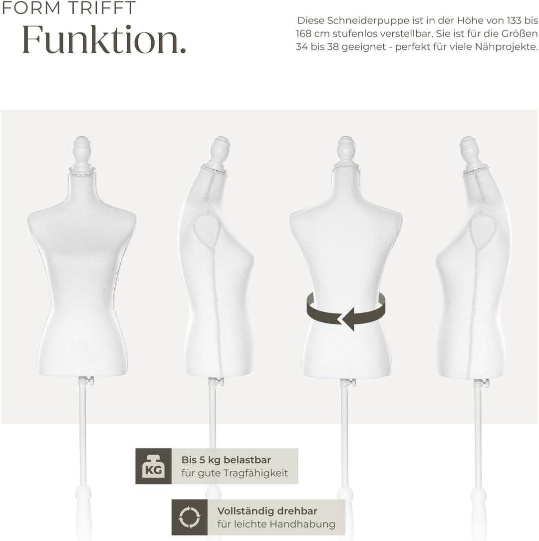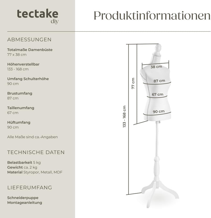 • Totalmasse Damenbüste (LxB): 78 x 38 cm // Höhenverstellbar: 133 – 168 cm // Gewicht: ca. 1,8 kg.