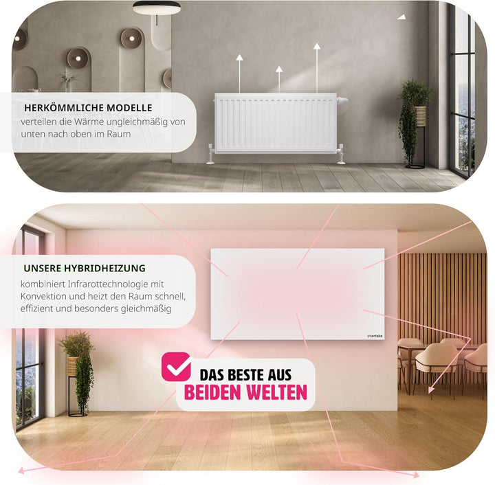 - ELEGEANTES DESIGN: Unsere Hybrid Heizplatte ist mehr als nur ein Elektro Heizkörper, sie ist ein stilvolles Wandpaneel mit den Vorzügen eines Infrarotstrahler, das sich nahtlos in Deine Einrichtung einfügt. Sie ist leicht zu reinigen und verfügt