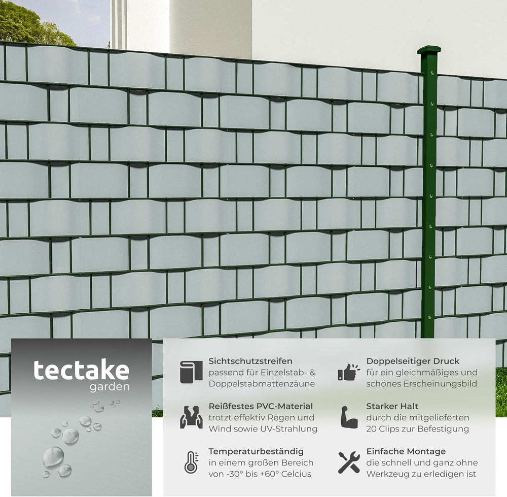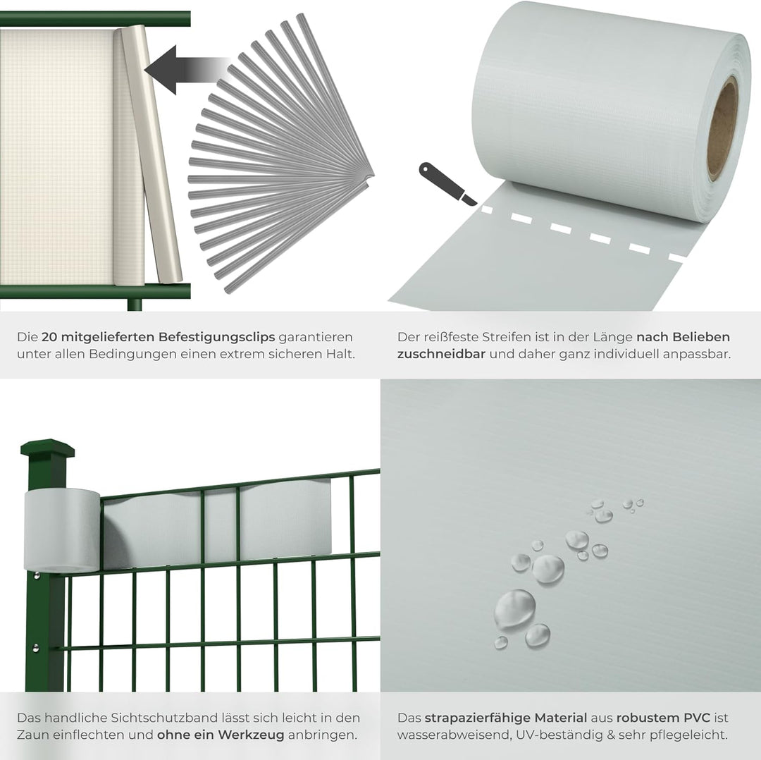 - Geeignet für alle gängigen Einzelstab- und Doppelstabmatten-Zäune. Vielseitige und hochwertige Sichtschutzfolie mit sehr vielen Vorzügen. Egal ob als Schutz vor Sonne, Wind und Wetter, als Sichtschutz oder auch als Lärmschutz. 450 g/m².