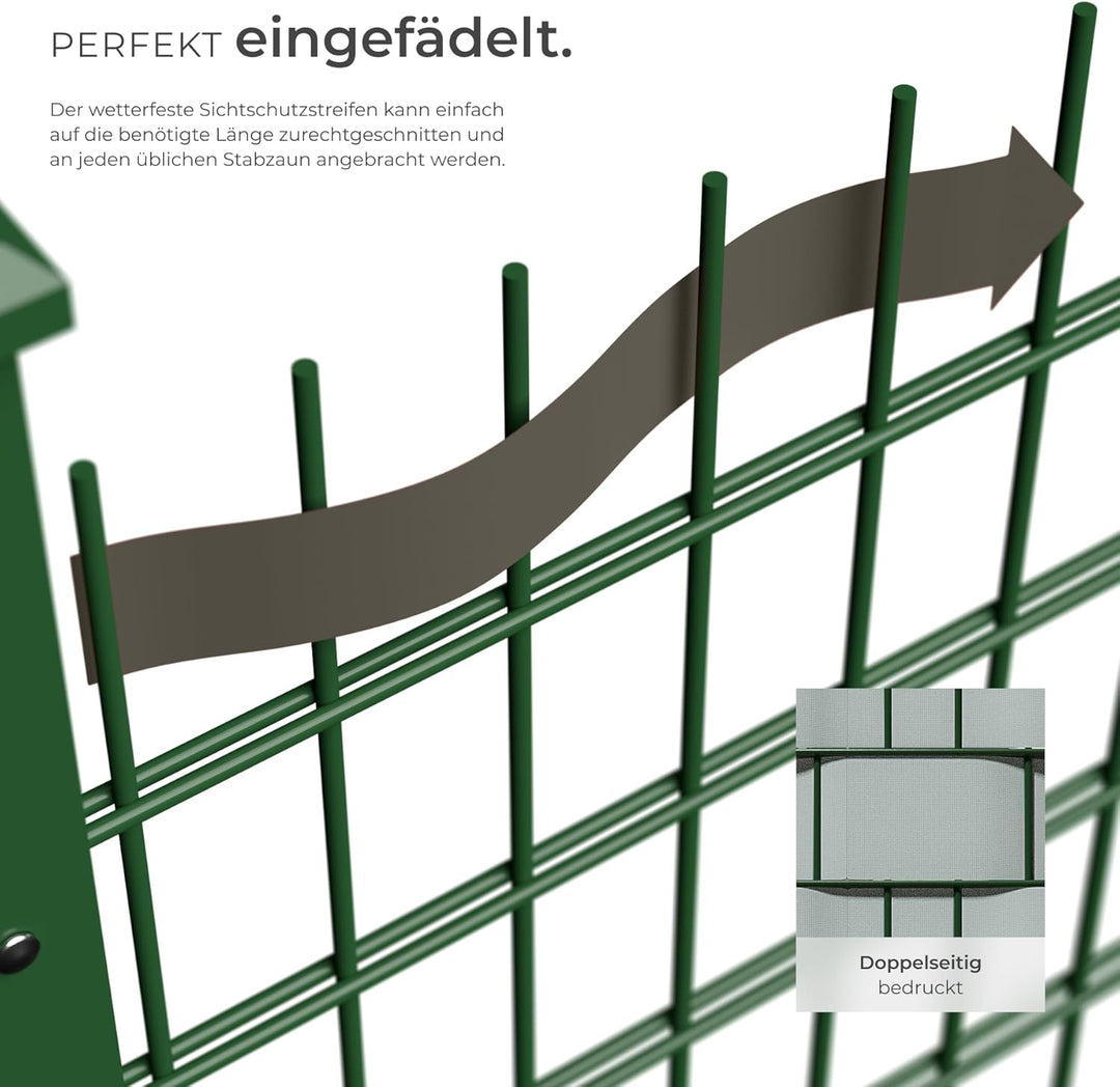 - Sichtschutzstreifen sind doppelseitig bedruckt, witterungs- und UV-beständig und reflexionsarm. Temperaturbereich: -30° C bis +60° C Eine beidseitige Beschichtung verhindert ein Ausbleichen der Farbe.