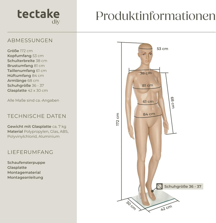 - Lebensechte Proportionen, eine natürliche Haltung sowie eine feine Gesichtszeichnung – diese Eigenschaften machen die Schaufensterpuppe von TecTake aus.