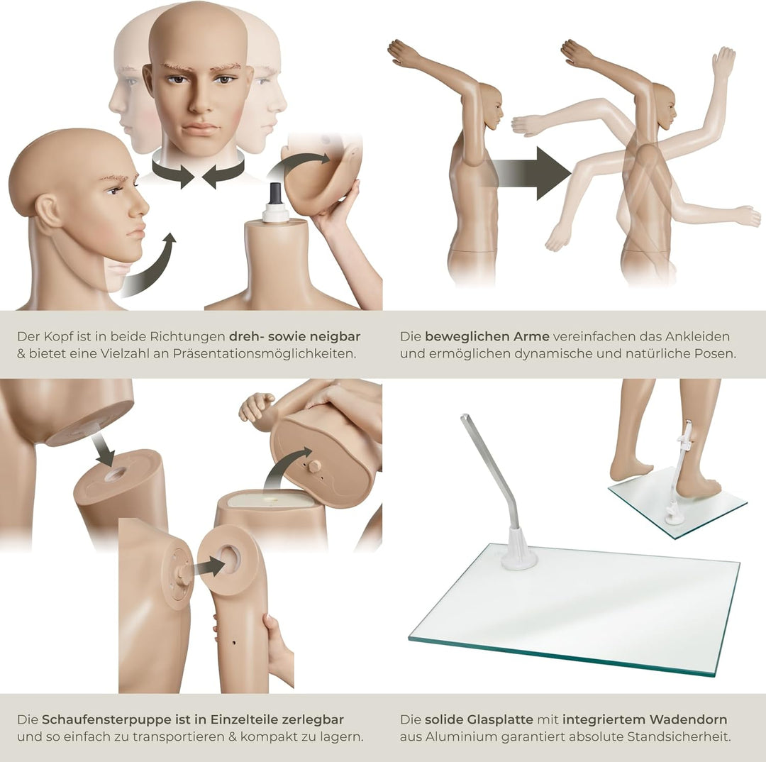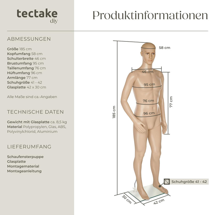 - Lebensechte Proportionen, eine natürliche Haltung sowie eine feine Gesichtszeichnung – diese Eigenschaften machen die Schaufensterpuppe von TecTake aus.
