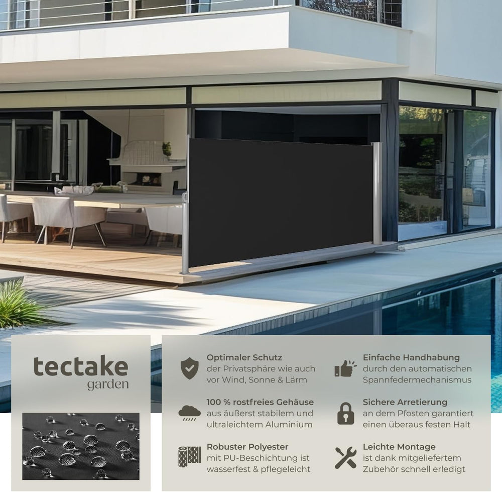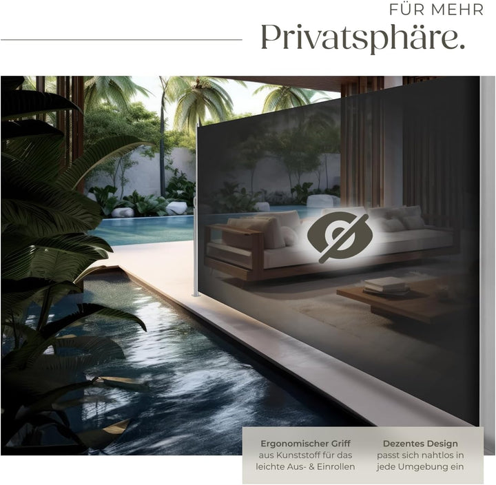 - EINFACH ZU HANDHABEN: Der Terrassen-Sichtschutz hat einen automatischen Aufrollmechanismus und ist bis zu 300 cm ausziehbar, also ist die Markise 3m breit. Der Zaun Sichtschutz aus 240 g/m² Polyester mit PU-Beschichtung ist zusätzlich wasserabweisend