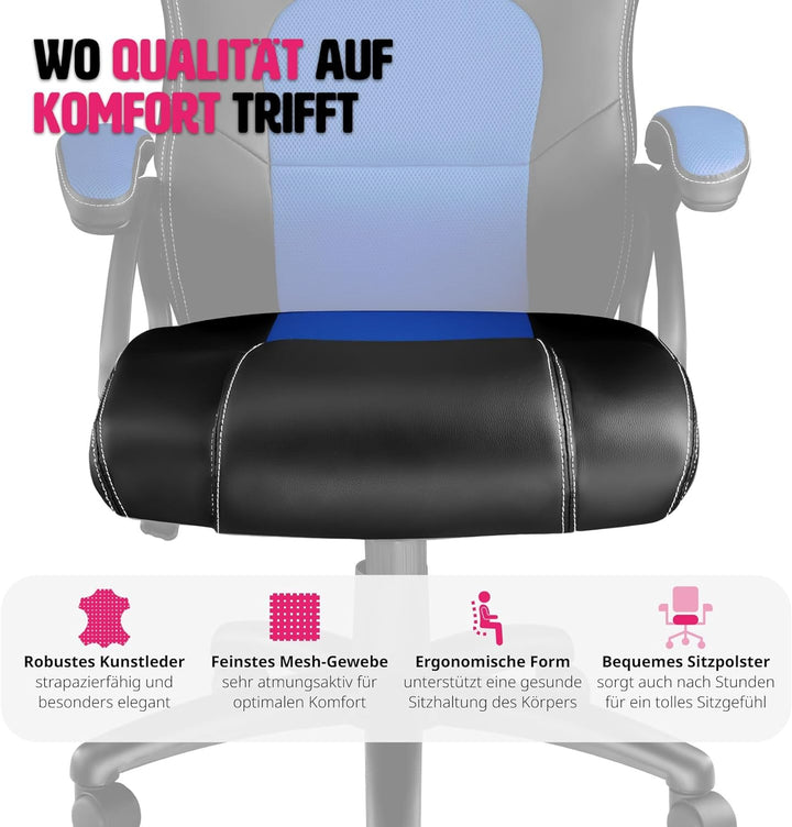 • OPTIMALE ANPASSUNG: Die ergonomische Form, die dicke Polsterung sowie die Einsätze aus luftigem Mesh-Gewebe zeichnen diesen PC-Sessels gerade an langen Arbeitstagen am Schreibtisch aus.