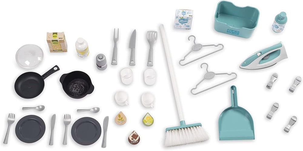 - 36-teiliges Spielset - Damit beim Spielen keine Langeweile aufkommt, ist die Spielküche umfangreich gefüllt: mit Geschirr, Kaffeemaschine, Soda-Sprudler, Besen, Bügeleisen & sogar Kleiderbügeln