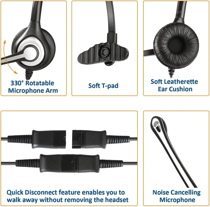 - Die Mehr Komfort Headset: Super leichter Büro telefon-RJ9-Kopfhörer mit verstellbarem Stirnband für alle Kopfgrössen, hochwertige und superweiche Kunstleder Ohrkissen verbessern den ganztätigen Tragekomfort. Dank des Quick Disconnect-Kabels können