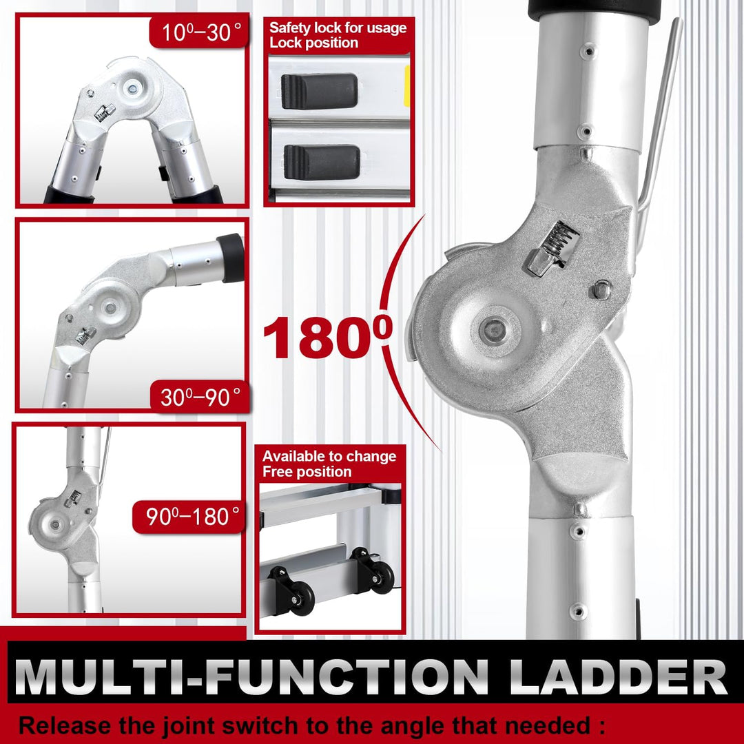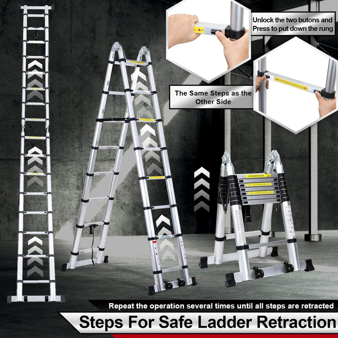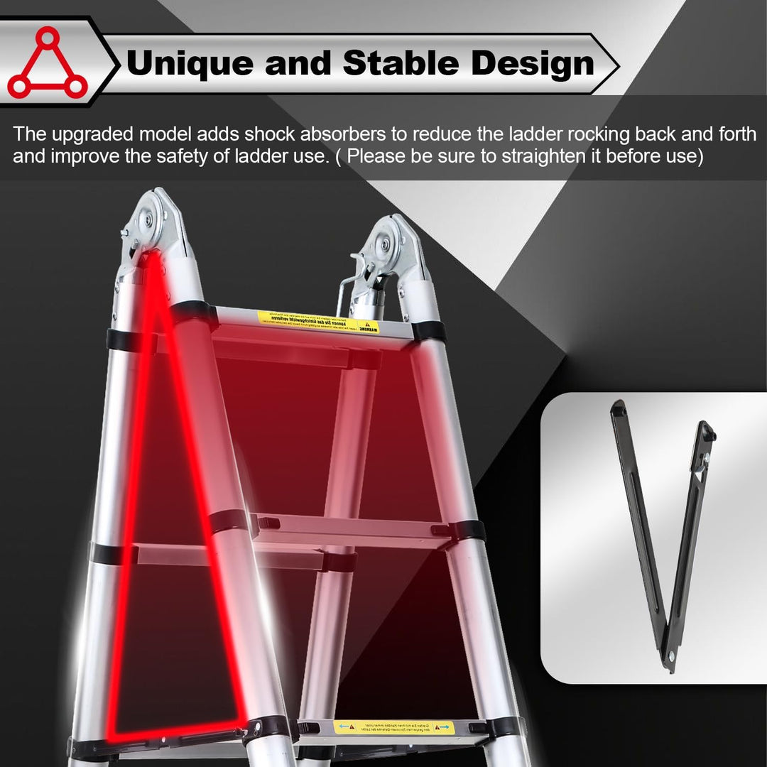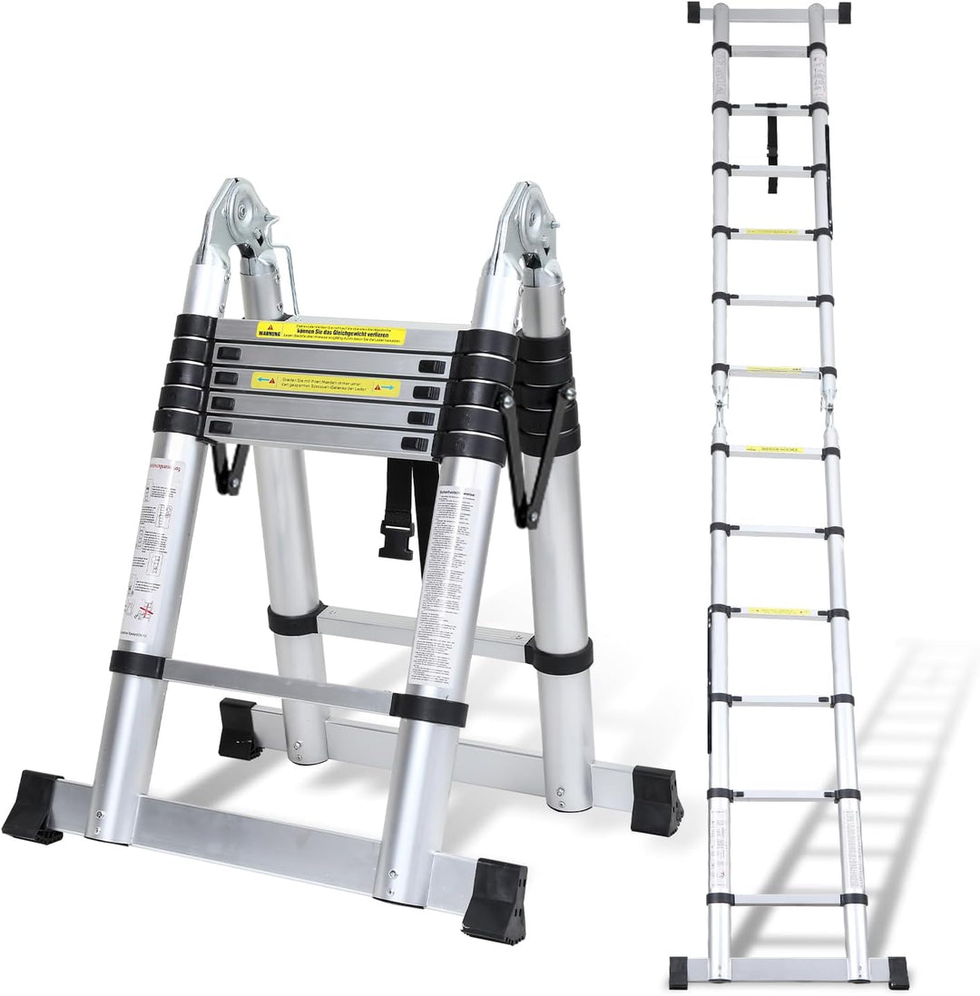 - đ„Klappbare Teleskopleiter: Die Leiter nimmt ein Klappdesign mit einer Höhe von 3.8(1.9+1.9) Metern und insgesamt 6+6 Stufen an. Bei jedem Schritt wird der Sicherungsstift automatisch gesperrt, sodass die Leiterhöhe nach Bedarf angepasst werden kann.