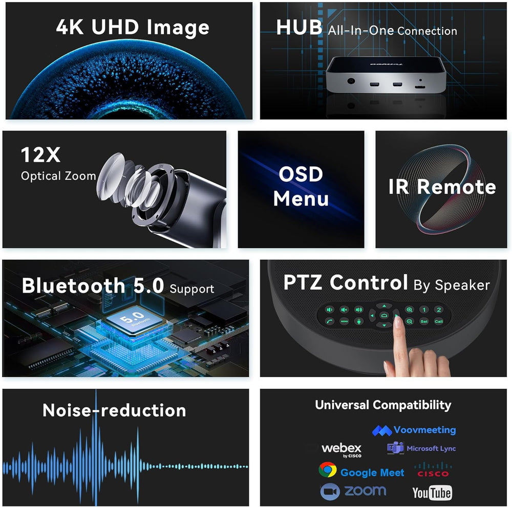 - 4K UHD und 12-fach optischer Zoom-Kamera: Premium PTZ Kamera mit Freisprecheinrichtung Konferenzsystem. Die Kamera verwendet einen CMOS-Sensor, der ein echtes 4K-Ultra-HD-Bild liefert und das gesamte Bild mit dem Weitwinkelobjektiv reibungslos anzeigen