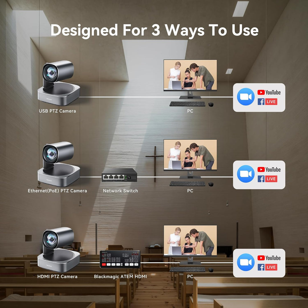 - 【Unterstützung für Mehrere Geräte】 Die VLoop-Videokonferenzkamera ist mit mehreren Geräten kompatibel und verfügt über USB 3.0-, HDMI- und PoE-Schnittstellen (zum Anschliessen benötigen Sie einen PoE-Switch). Die Kamera kann in Unternehmen,