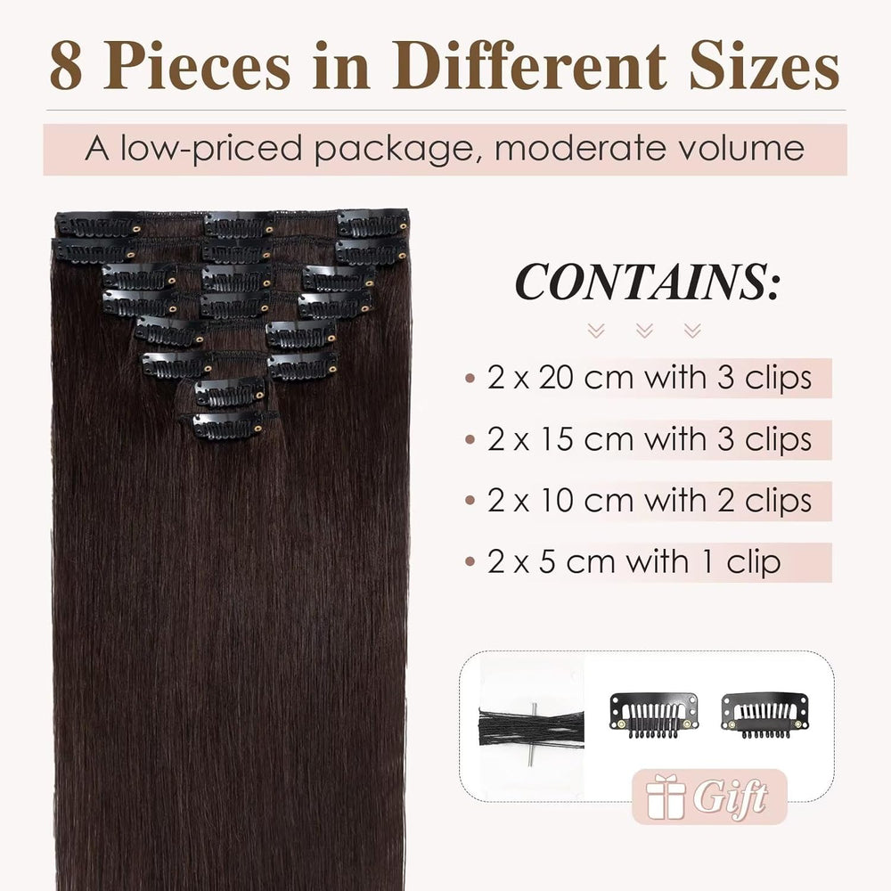 - 【Spezifikationen für Echthaar Extensions Clip】 8 leichte Haarverlängerungen mit Tressen, erhältlich in Längen von 20 cm bis 60 cm und mit Nettogewichten von 50 g bis 70 g. 2 zusätzliche Clips im Lieferumfang enthalten für den Fall, dass die