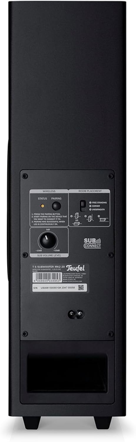 - Innovativer, platzsparender T 6 Subwoofer für tiefen, präzisen Kickbass, liegend (unterm Sofa) oder stehend platzierbar, Klangbild an Aufstellung anpassbar