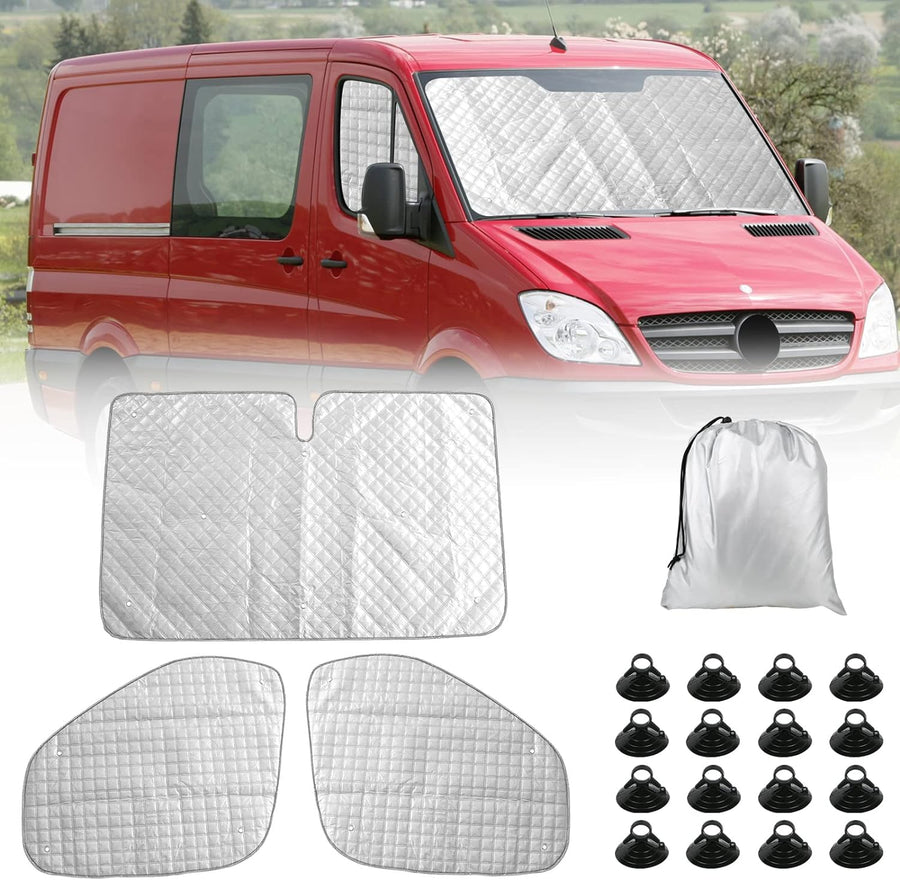 - Thermomatte Fahrerhaus Innen: Kommt mit 1 Frontscheibe Abdeckung und 2 Seitenfenster Jalousien Abdeckung. Auch mit 1 Aufbewahrungstasche und 16 extra starken Saugnäpfen zur Befestigung der Abdeckung.