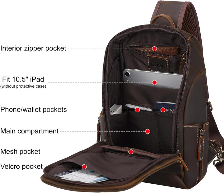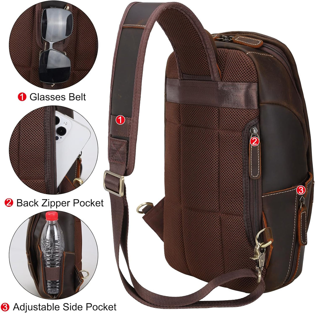 - 【Premium-Material】Hergestellt aus 2 mm dickem vollnarbigem Rindsleder, ausgestattet mit hochwertigen YKK-Reissverschlüssen und langlebigen Nähten. Der Rücken und der Schultergurt sind mit atmungsaktiver Polsterung ausgestattet, um Ihnen Komfort zu