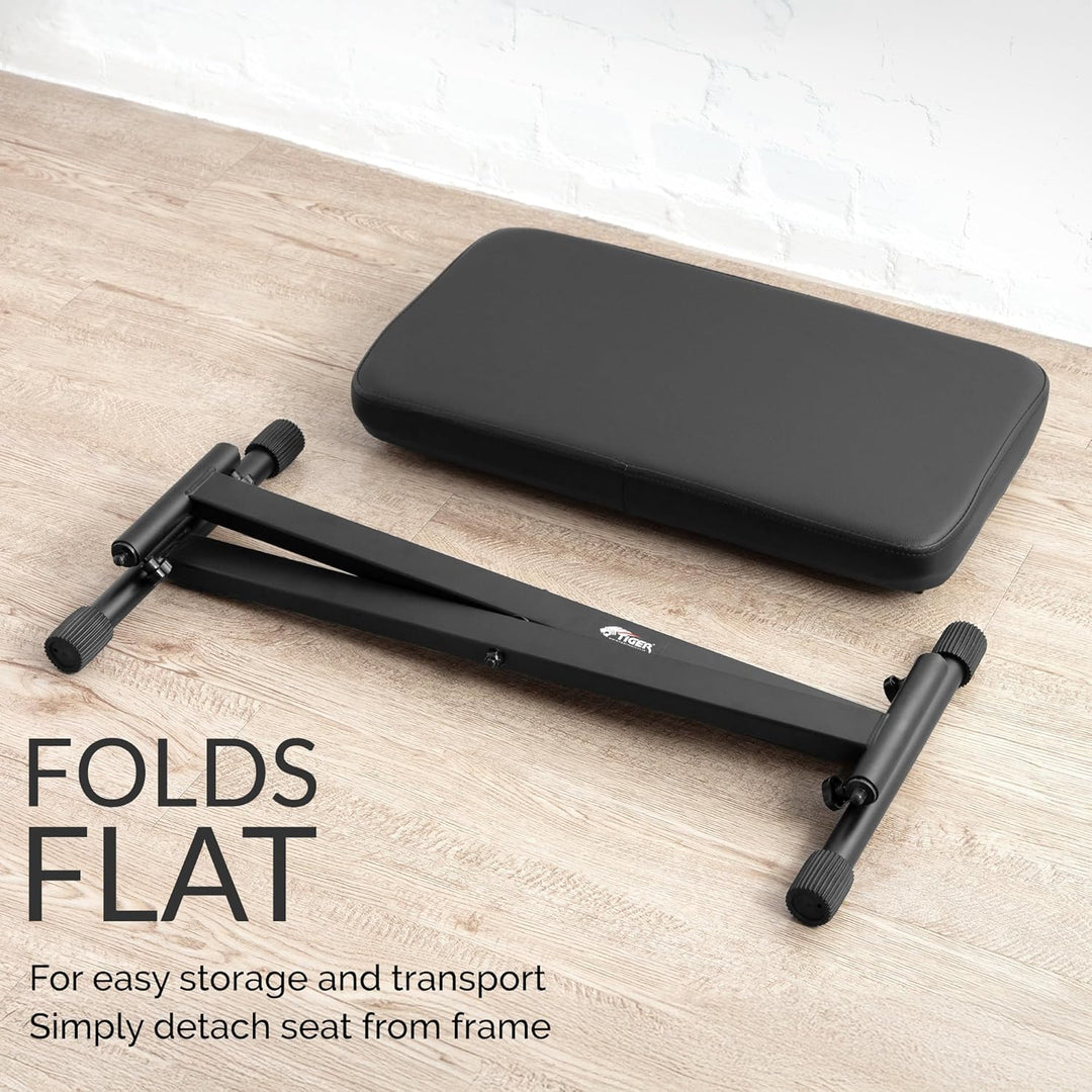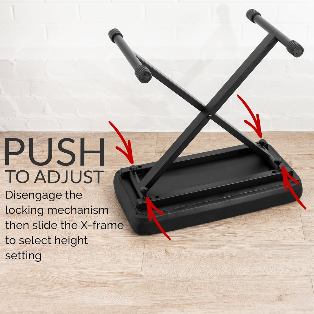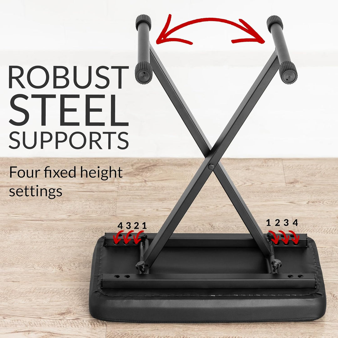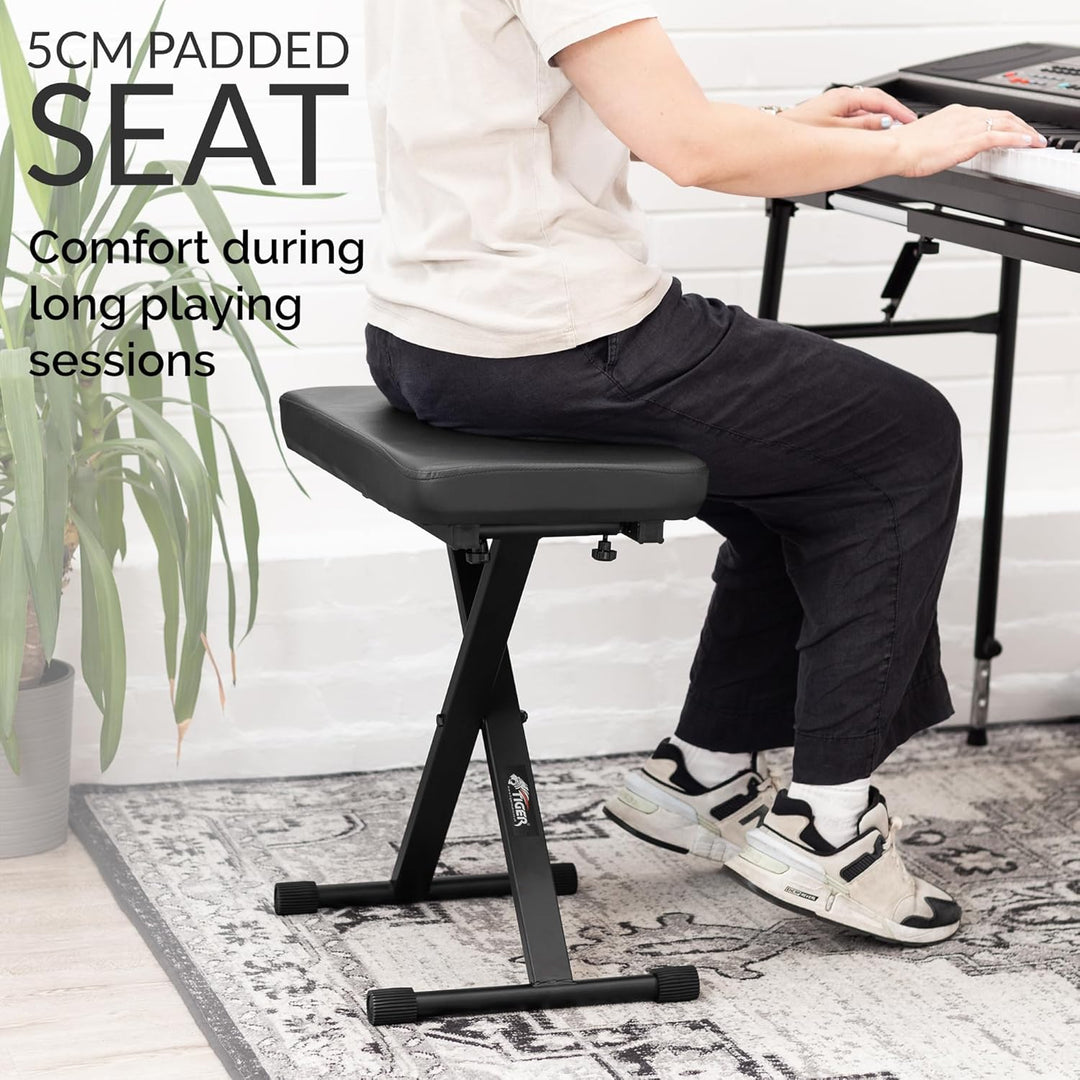 - Das grosszügig bemessene 5cm dicke Sitzpolster und der 54cmx29cm grosse Sitz lassen den Hocker selbst bei längsten Übungsstunden oder Auftritten komfortabel bleiben.