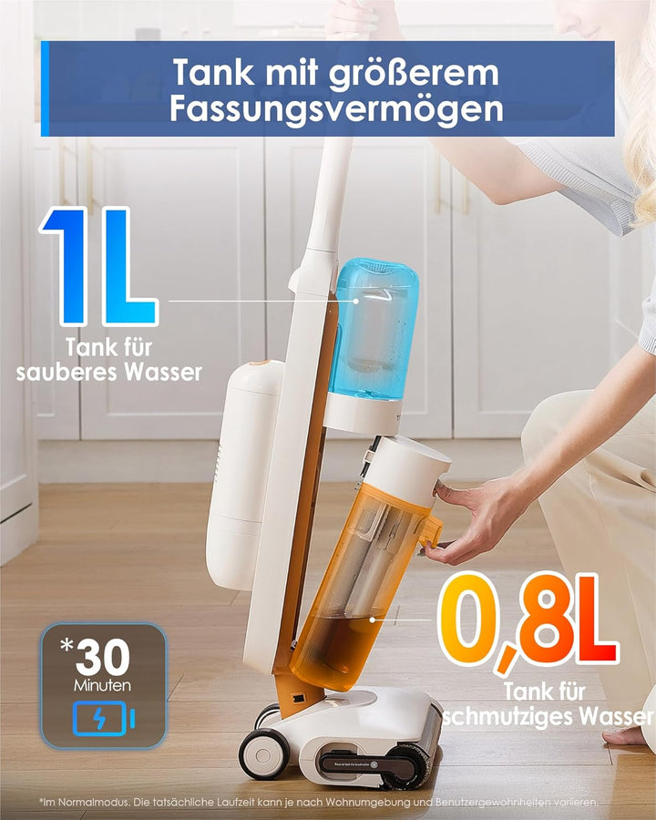 • Saugen und Waschen in einem Schritt: Spare Zeit und Mühe, mit dem wischsauger kannst du deine Böden gleichzeitig saugen und wischen.