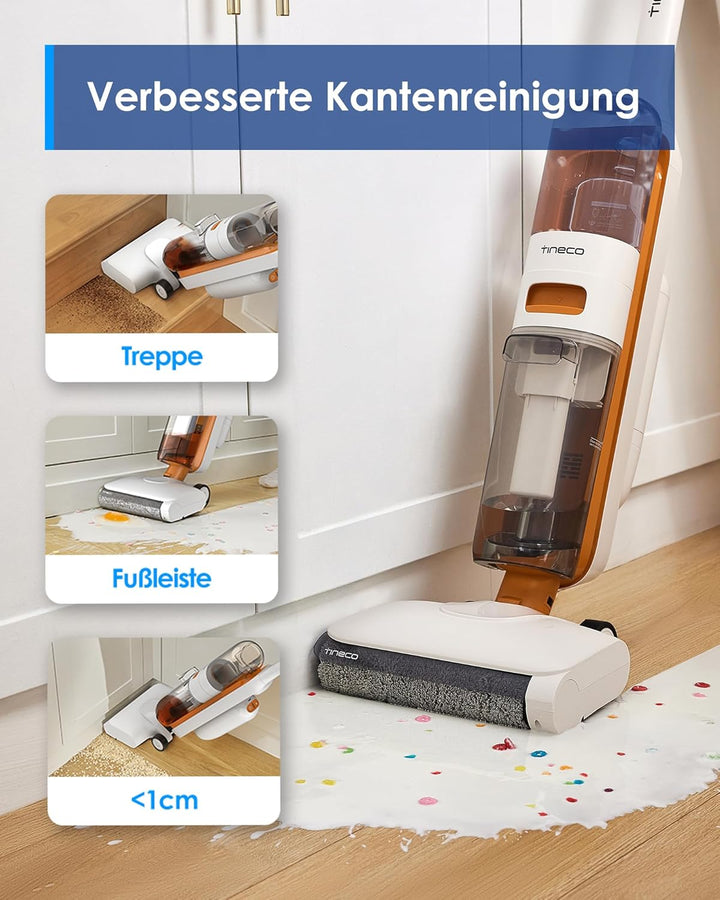 • Verbesserte Kantenreinigung für noch mehr Präzision: Der exklusive Bürstenkopf von Tineco iFloor Y2 Nass- & Trockensauger reinigt mühelos enge Stellen und liefert streifenfreie Ergebnisse entlang von Fussleisten und in engen Ecken.