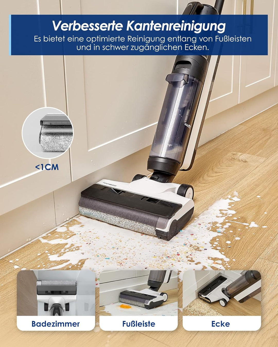 • VERBESSERTE KANTEN- UND ECKENREINIGUNG: Das exklusive Bürstenkopfdesign des Bodenreinigers sorgt für eine optimierte, streifenfreie Reinigung entlang Fussleisten und in schwer zugängliche Ecken. Ihre Böden werden in wenigen Minuten vollständig trocken und streifenfrei.
