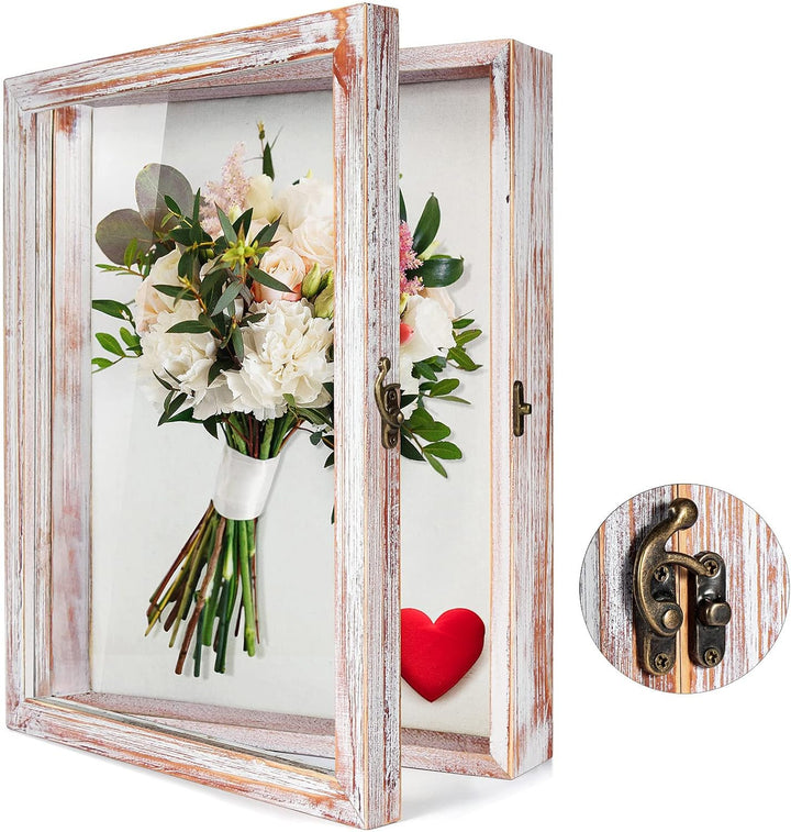 - Scharniertür – Die vordere Displaytür erleichtert das Platzieren oder Austauschen von Gegenständen im Inneren. Das Retro-Hornschloss macht die Schattenbox abschliessbar und sicherer und verhindert, dass die Gegenstände im Inneren herausfallen.