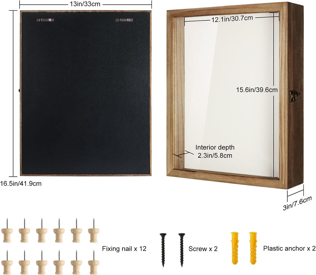 - Hochwertige Materialien - Die 42 x 33 x 6cm tiefe Schattenbox kommt mit einem soliden, langlebigen Holzrahmen, gewebten Stoffinnenraum mit 12 Stecknadeln, Hasp Horn Schloss Tür mit einem transparenten bruchsicheren Glasfenster und zwei
