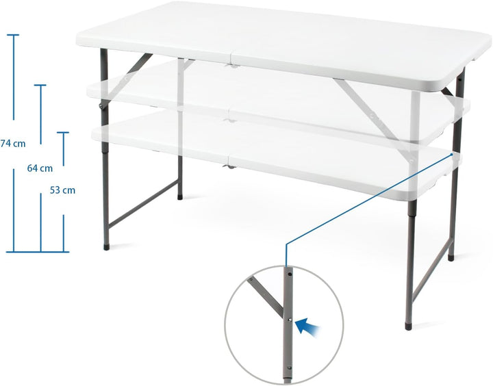 • Verstellbar - Die Höhe des Klapptisches kann je nach Bedarf auf 74cm, 64cm und 53cm eingestellt werden. Je nach Zweck und Person, die den Tisch benutzt, können Sie ihn entsprechend der Stuhlhöhe einstellen.