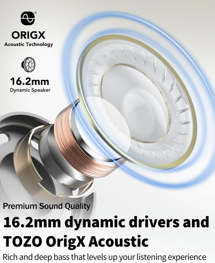 - [16 mm dynamische Treiber] Durch präzise Anpassung und professionelle Tests passt TOZO Acoustic Lab leistungsstarke 16 mm dynamische Treibersysteme für Kopfhörer an und bringt Ihnen schönere und transparente Soundeffekte. Stellen Sie verschiedene