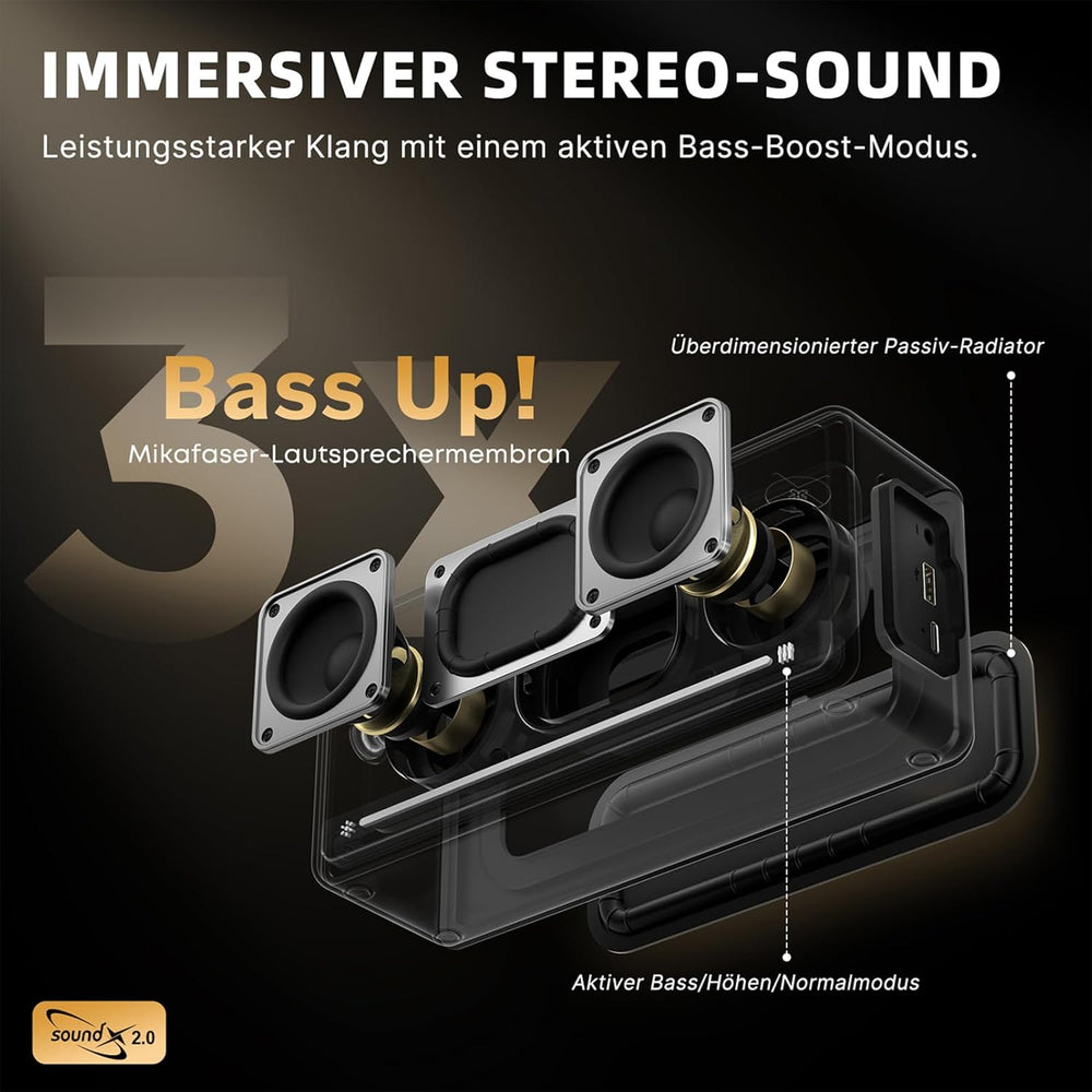 - [Immersiver Sound & Kraftvoller Bass] Verbessern Sie Ihr Hörerlebnis mit diesem kabellosen bluetooth-Lautsprecher. Der dreifach vergrösserte passive Radiator liefert kraftvollen, tiefen Bass, während anpassbare Bass- und Höhenmodi eine individuelle