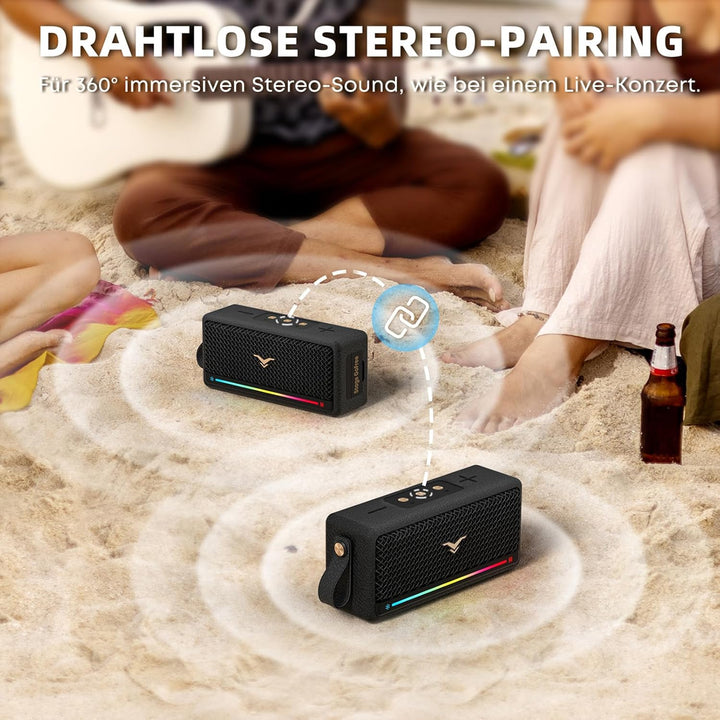 - [Fortschrittliches Bluetooth 5.3 & Dual-Pairing] Mit der neuesten Bluetooth 5.3-Technologie bietet, garantiert dieser musikbox bluetooth eine aussergewöhnlich stabile Verbindung mit einer Reichweite von bis zu 30 Metern. Die True Wireless